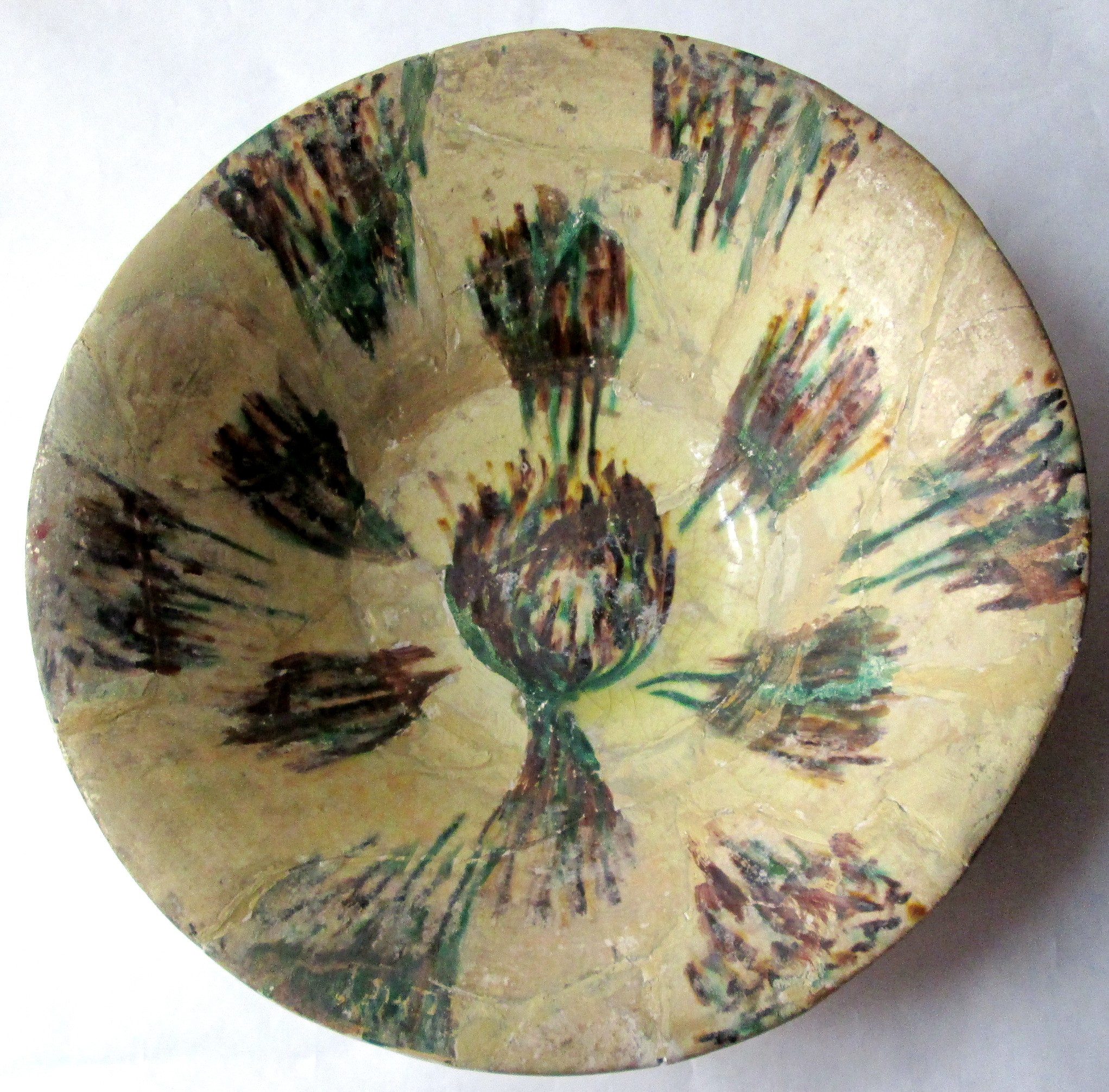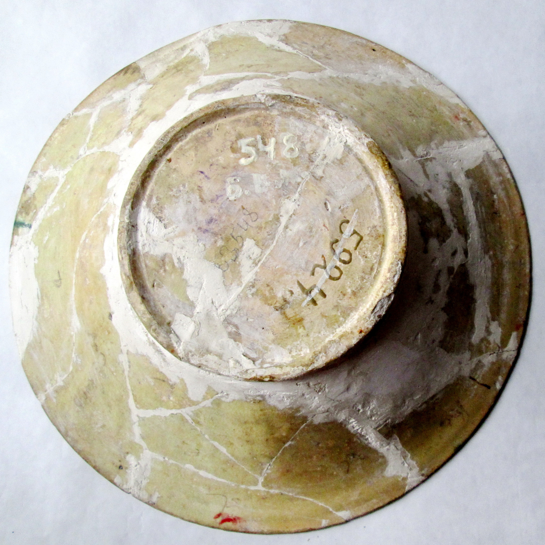 Розбита на безліч шматків. Склеєна. Реставрована, 1951 р,