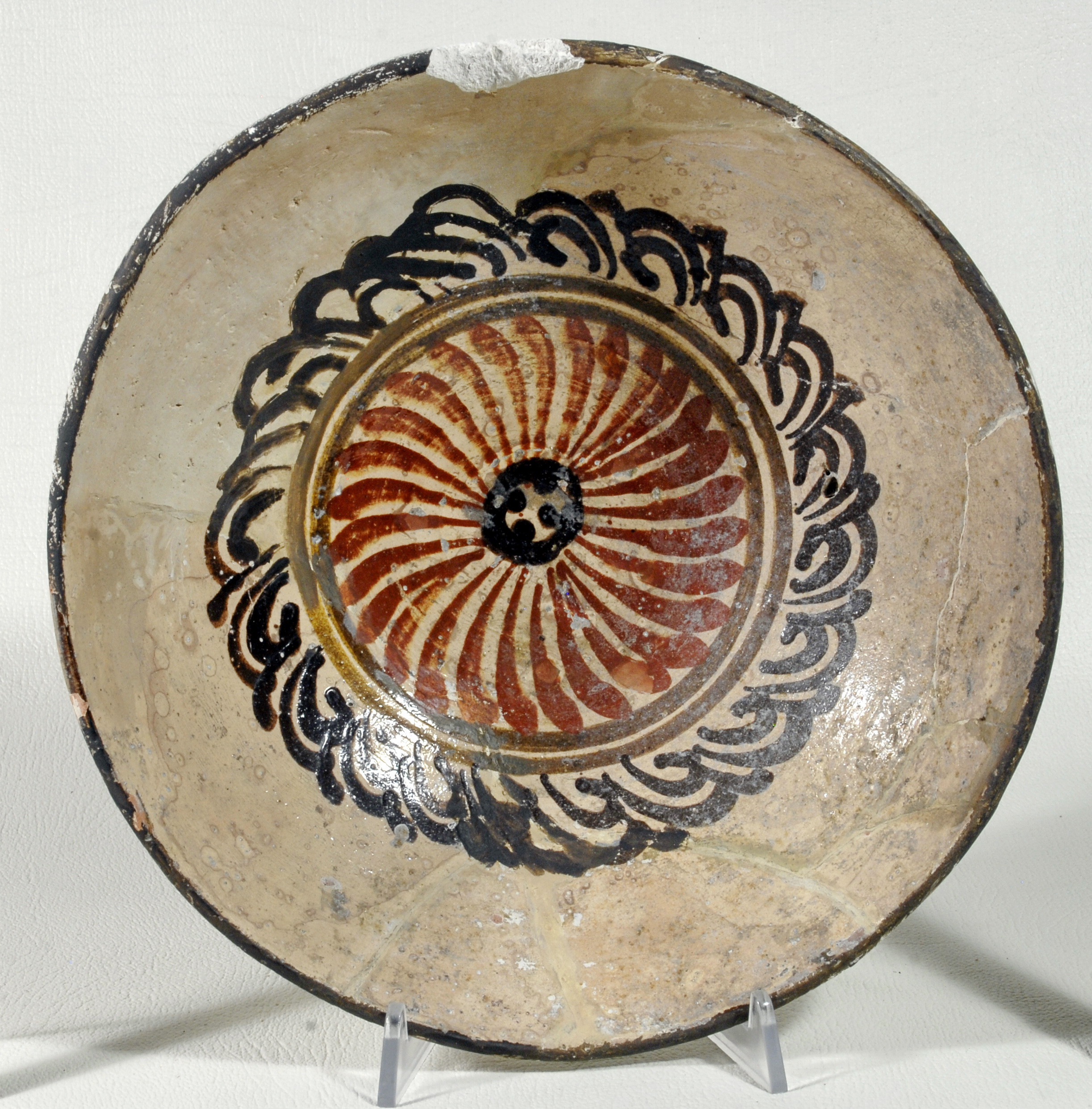 Розбита на багато шматків.Склеєна. Реставрована, 1951 р. Щільні пеило-жирові нашарування. Склеєна з фрагментів. Частина борту доповнена. Тонуваня та мастиковки грубі. Втрати та лущення поливи. Потребує реставрації.,