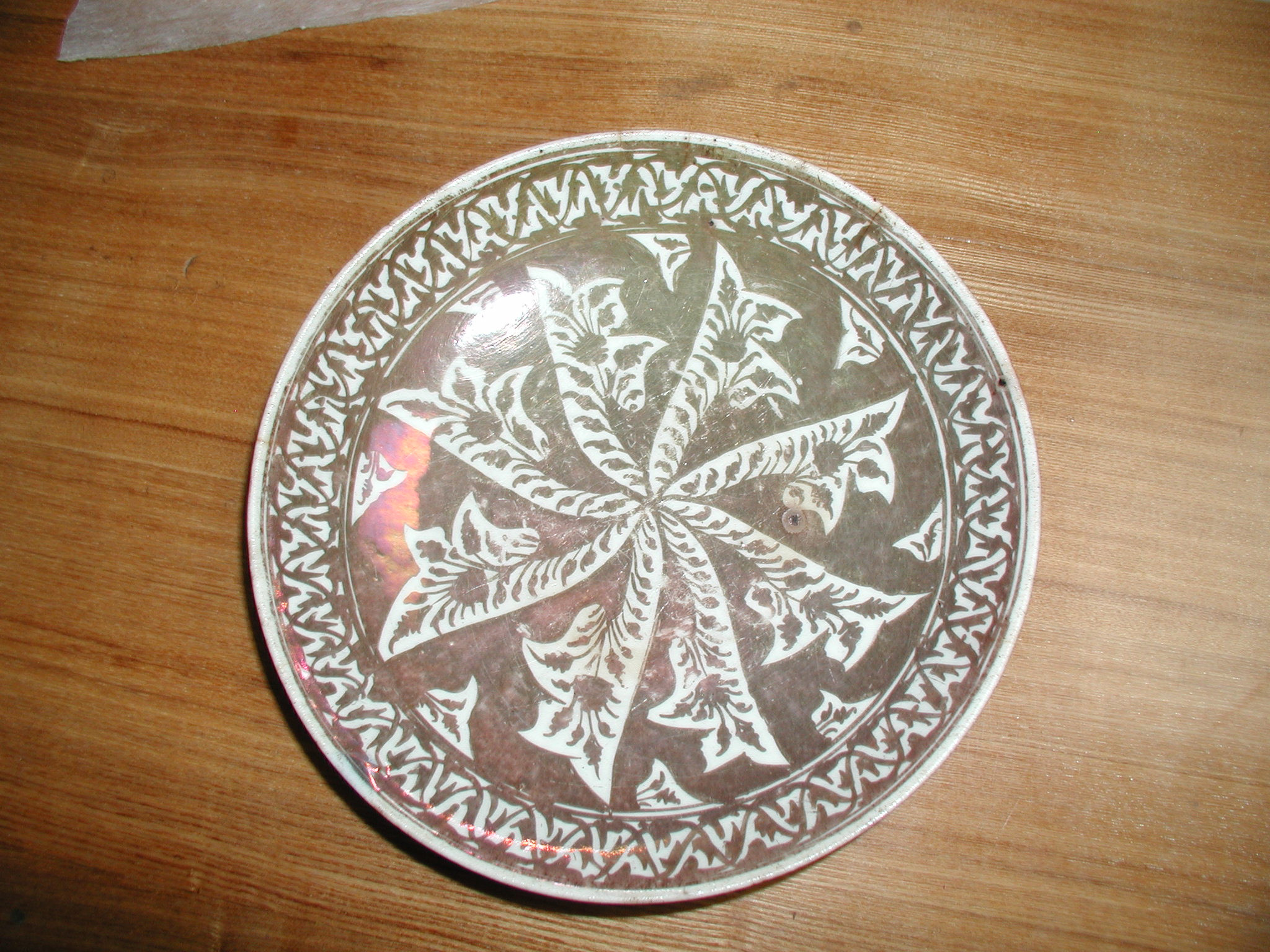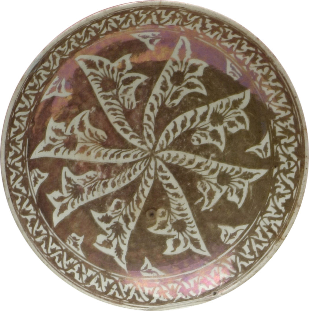 /Кількість: 1/Побутування/творiв такого типу: This small bowl, deep and with thin walls, belongs to a type that was common in Iranian productions of the period. The metallic luster technique first appeared in Iraq during the 9th century and was particularly in fashion in Seljuk Iran. But, as the production process was complex, it was abandoned toward the middle of the 14th century. After an initial firing at a high temperature, a metal oxide decoration was painted on the piece. It was then re-fired at a lower temperature in a reducing atmosphere. Around 1650, however, lusterware had a revival and objects decorated by this technique were once again frequent. They lasted up until the 18th century. There were, nevertheless, certain technical modifications such as the change of the tonality of the luster from gold to brown. Moreover, the color of the luster often has a bluer or more violet reflection, a change that appears to be due to temperature variations during firing rather than to any modification in the composition of the glaze.