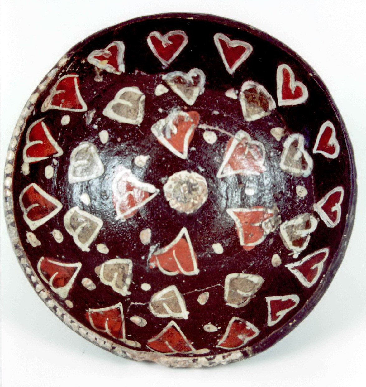 Склеєна, дороблена. Щільні пило-жирові нашарування. Склеєна з фрагментів. Частина борту доповнена. Шви та мастиковки грубо виконані. Потертості поливи. Потребує реставрації.,
