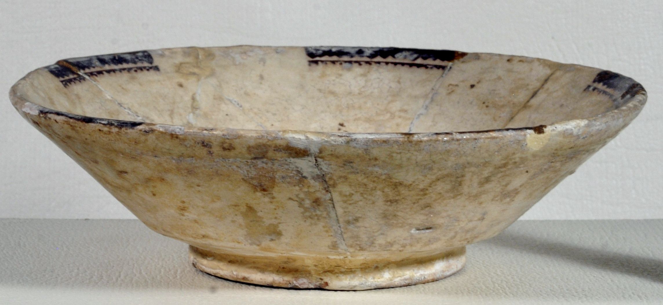 Склеєна.Щільні пило-жирові нашарування. Склеєна з фрагментів. Реставраційні шви розходяться, тонування грубі. Потребує реставрації,