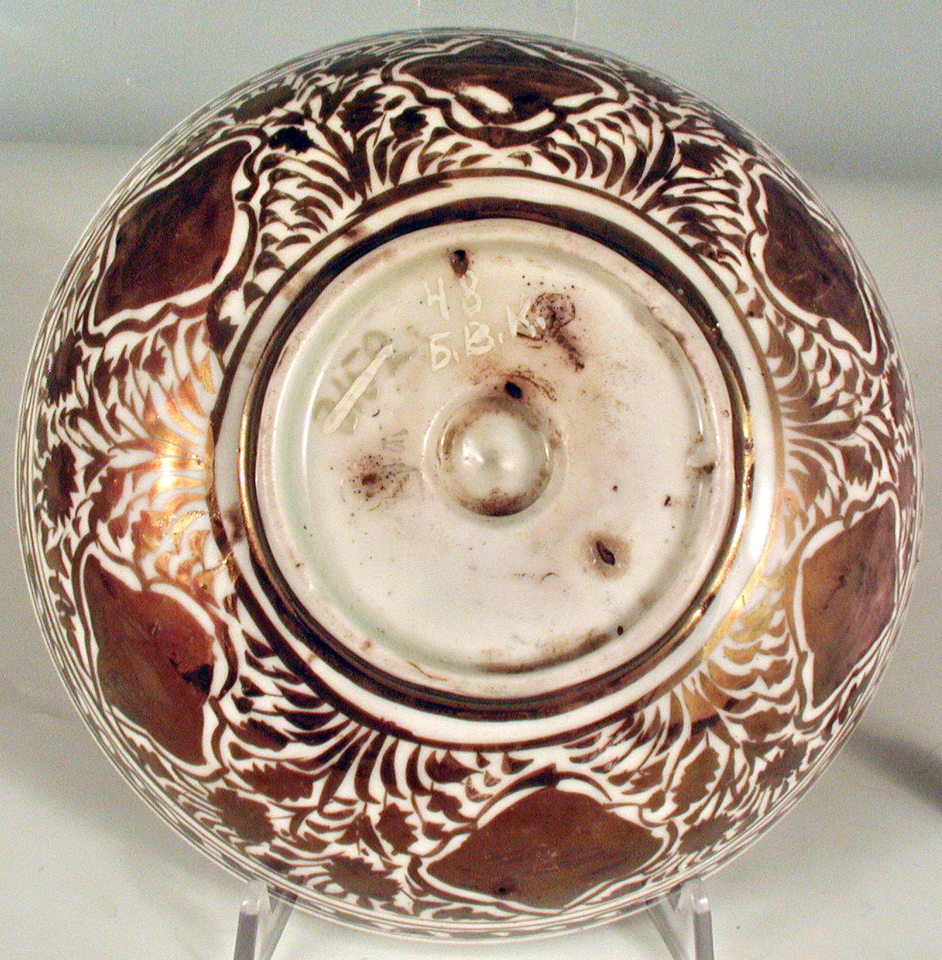 /Кількість: 1/Побутування/творiв такого типу: This small bowl, deep and with thin walls, belongs to a type that was common in Iranian productions of the period. The metallic luster technique first appeared in Iraq during the 9th century and was particularly in fashion in Seljuk Iran. But, as the production process was complex, it was abandoned toward the middle of the 14th century. After an initial firing at a high temperature, a metal oxide decoration was painted on the piece. It was then re-fired at a lower temperature in a reducing atmosphere. Around 1650, however, lusterware had a revival and objects decorated by this technique were once again frequent. They lasted up until the 18th century. There were, nevertheless, certain technical modifications such as the change of the tonality of the luster from gold to brown. Moreover, the color of the luster often has a bluer or more violet reflection, a change that appears to be due to temperature variations during firing rather than to any modification in the composition of the glaze.