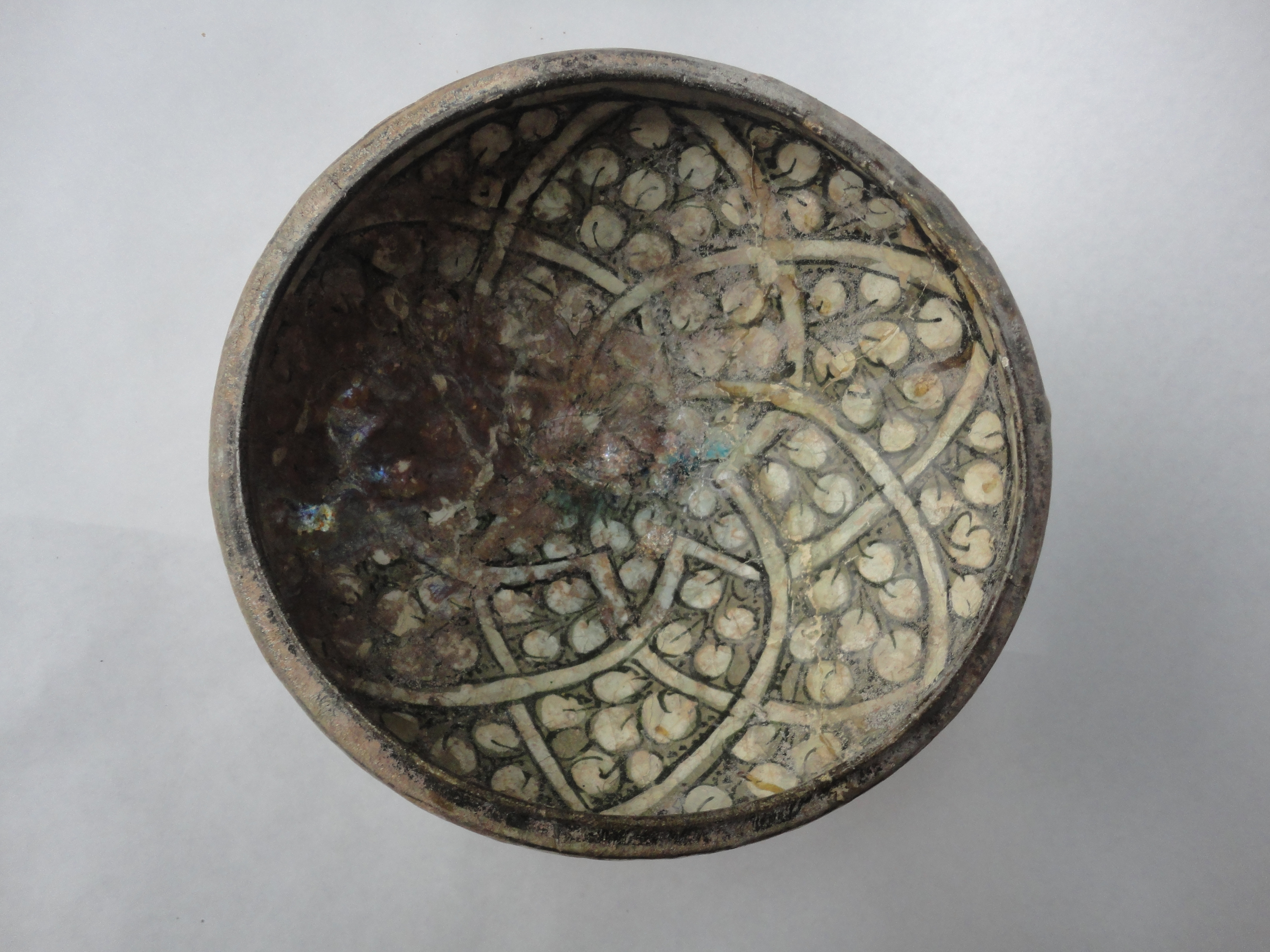 Закладка “Атрибуція” - Наим. предмета, издания: Чаша/Змiн.додаток до назва (лист, ...): Чаша "султанабадського" типу з підглазурним розписом/Змiн.опис: Чаша глибока напівсферичної форми з увігнутим до середини бортом, на кільцевій ніжці. Розписана підглазурно, частковий рельєф. Композиція внутрішньої поверхні центрична: на темно-сірому тлі тонка біла стрічка переплітаючись утворює велику зірку-розетку з шістьма пелюстками. Тло мотиву заповнено невеликими округлими білими рослинними формами (гілки з листям чи квітами) невисокого рельєфу. Контури білих елементів підкреслено зеленкувано-чорними контурами, так само виділено риски гілок. На зовнішній стороні – декор у вигляді вузьких високих арок. Колір маси жовтувато-сірий./Змiн. час створення: XIV ст.місце створення, школа: ймовірно, КашанНовый материал: кашин (фаянс)Новый материал: сірий ангобНовый материал: чорний барвник (сполуки хрому)Новый материал: білий барвникНовый материал: полива свинцеваПериод: доба ІльханідівИзм. техника: підглазурний поліхромний розписИзм. техника: поливаИзм. техника: випал
