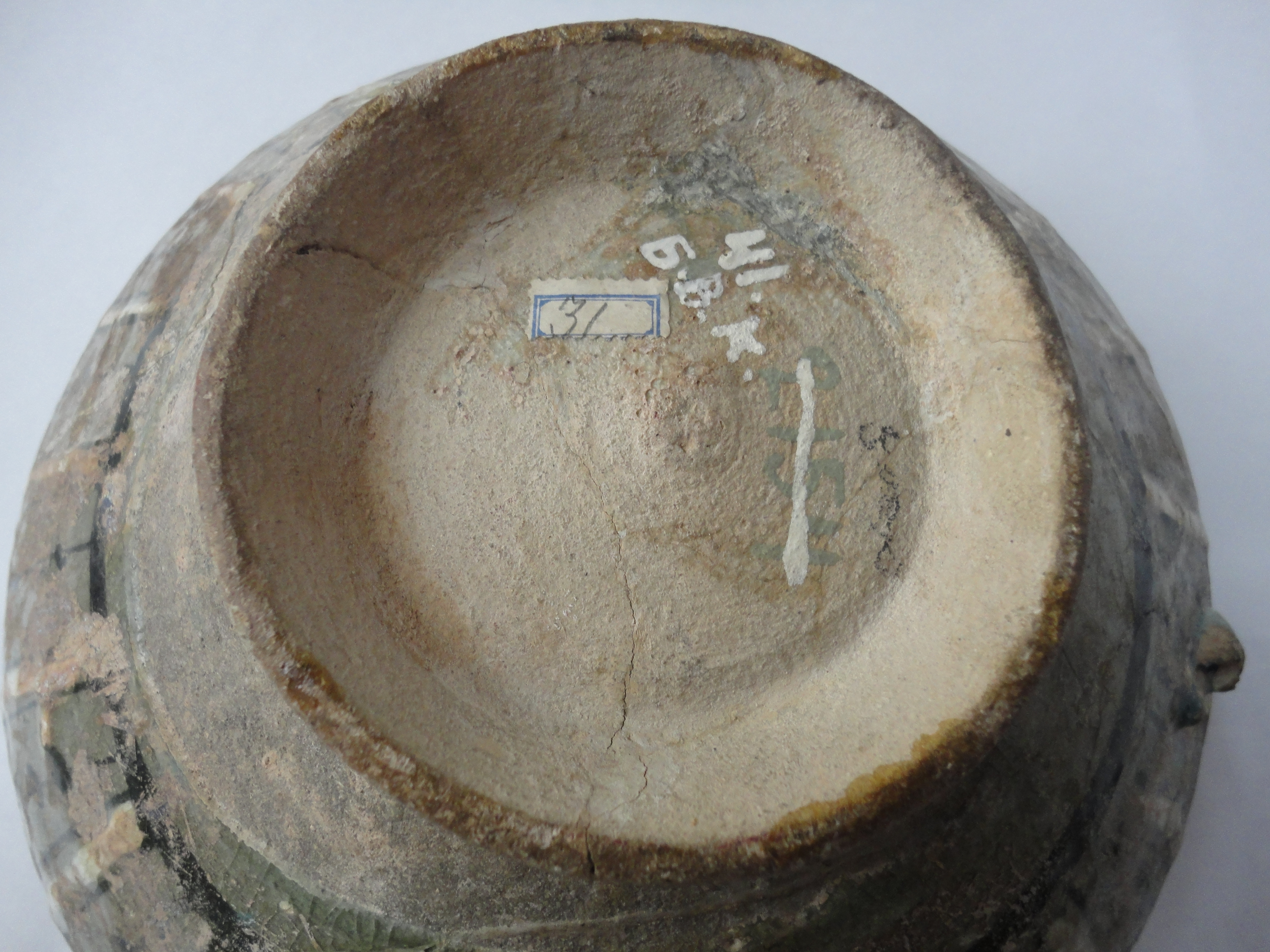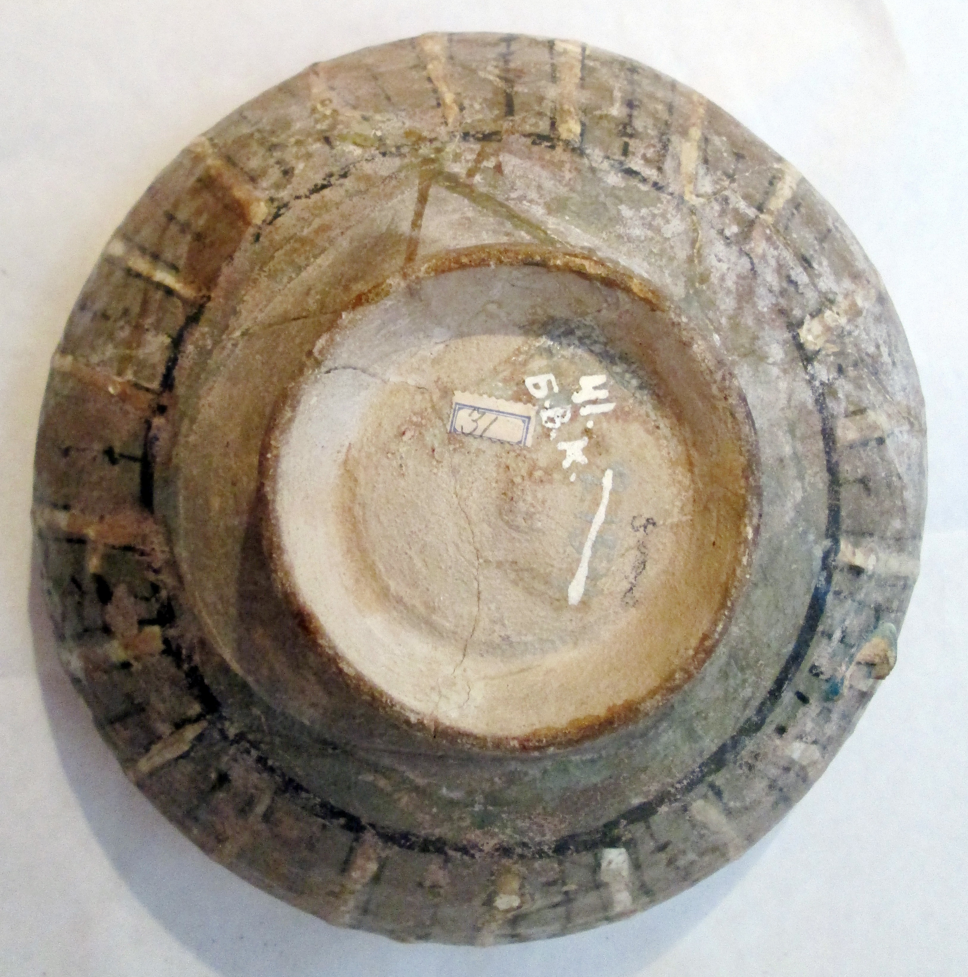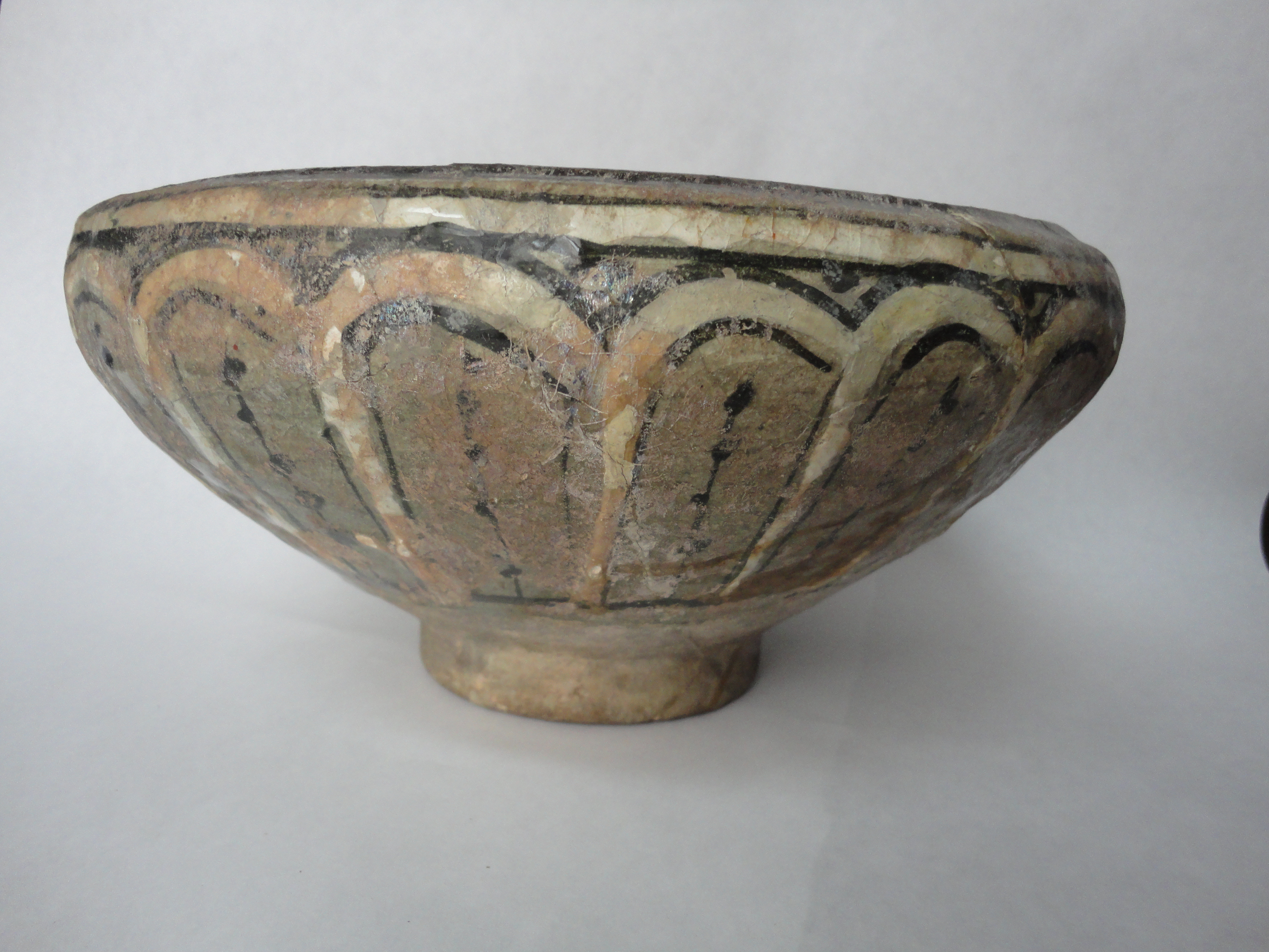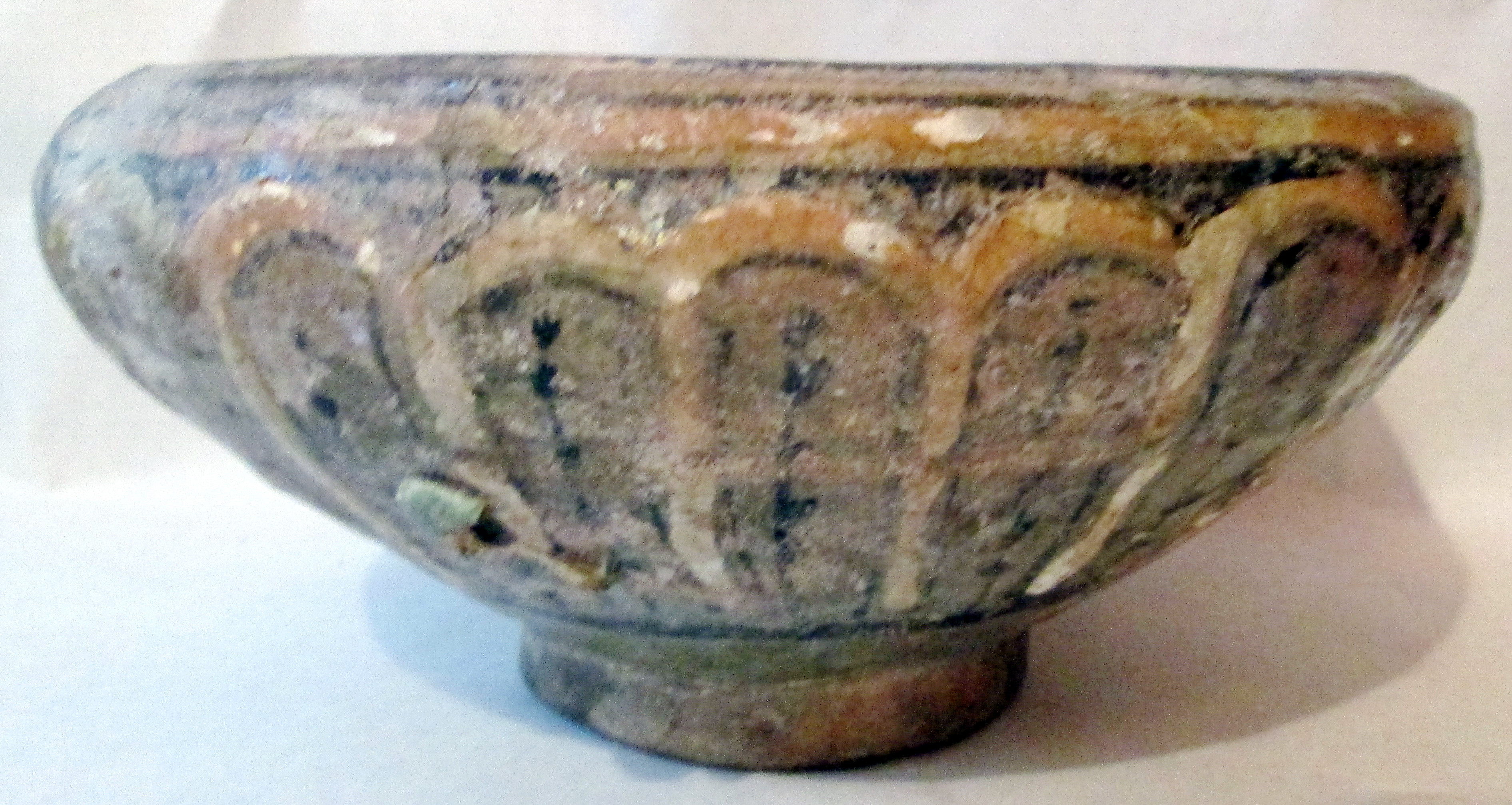 Its angular shape with a wide rim overhanging both interior and exterior is typical of the time. Such is the decoration in slip painting that covers interior and exterior except for the low foot. Black is used for the outlines of the decoration.