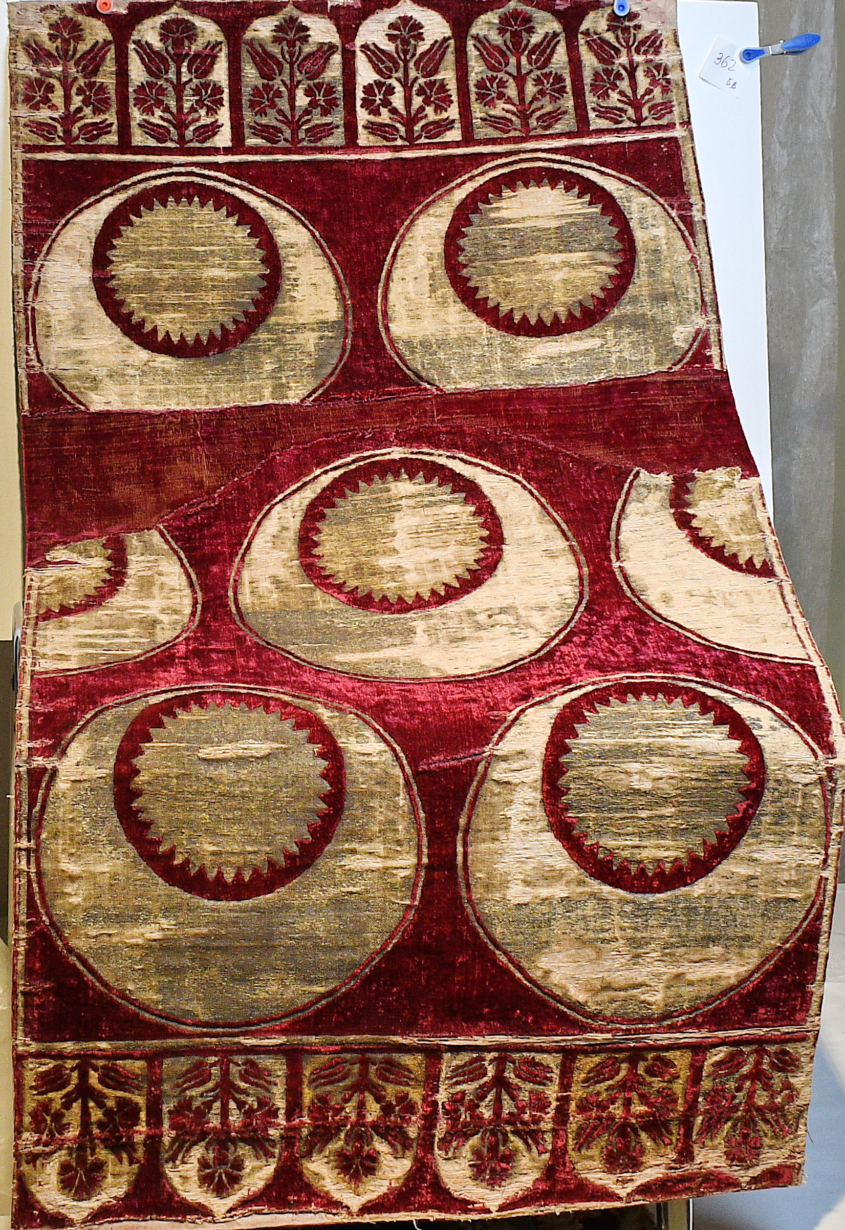 Silk, cotton, “silver” metal strips wrapped around a silk core, warp-float faced satin weave with “silver” supplementary metal-wrapped silk brocading wefts, supplementary binding wefts, and supplementary warps forming cut and voided velvet