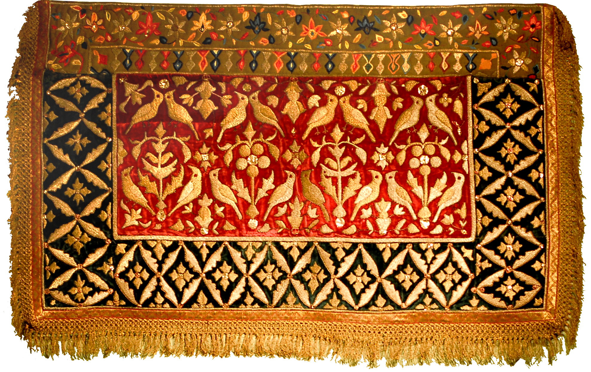 Закладка “Атрибуція” - Наим. предмета, издания: Килимок/Змiн. час створення: перша половина XIX ст.місце створення, школа: ІранНовый материал: шовкНовый материал: золота ниткаНовый материал: срібна ниткаНовый материал: фольгаПериод: доба КаджарівИзм. техника: ворсове ткацтвоИзм. техника: вишивка шовком та металевою ниткою