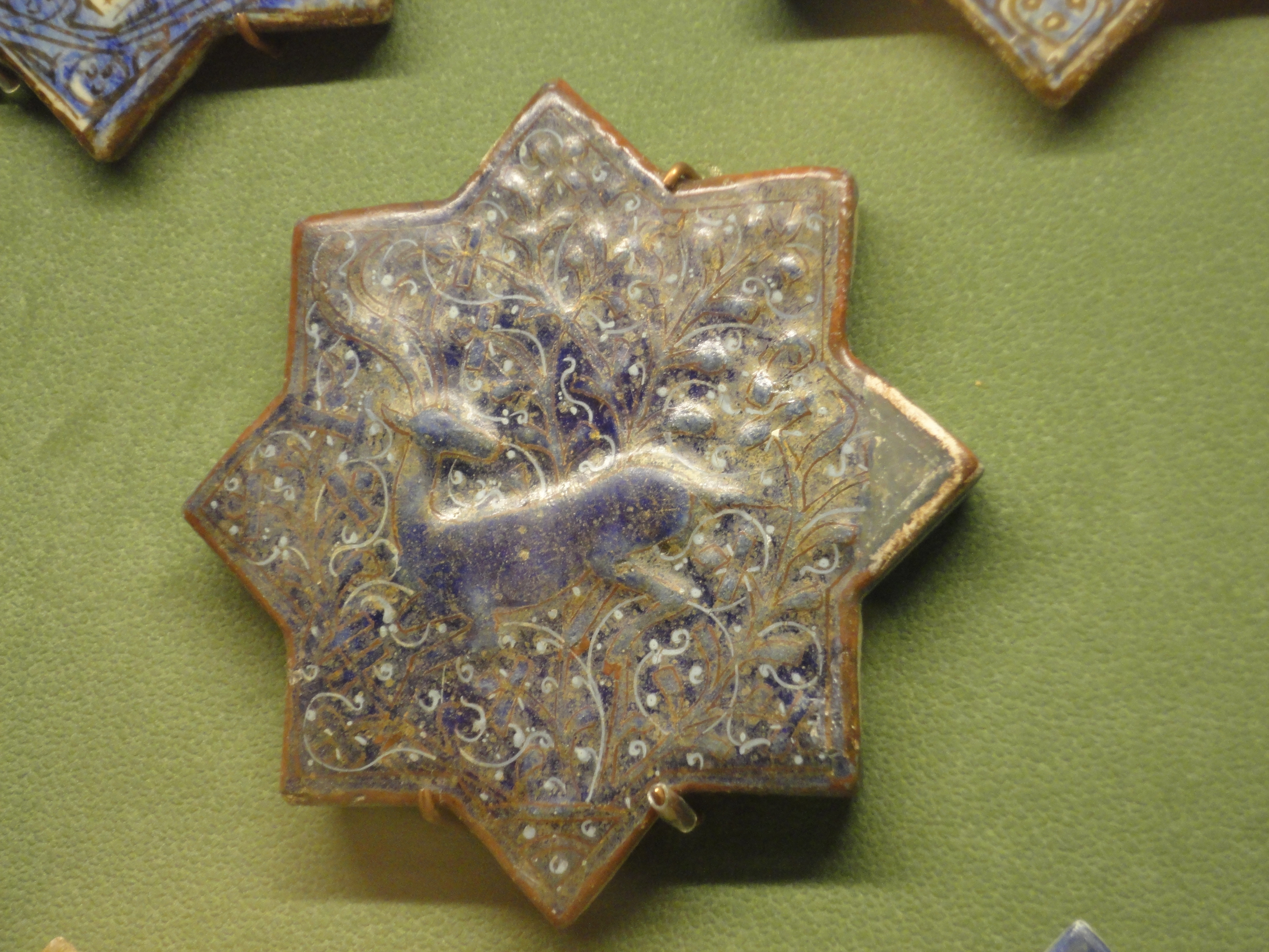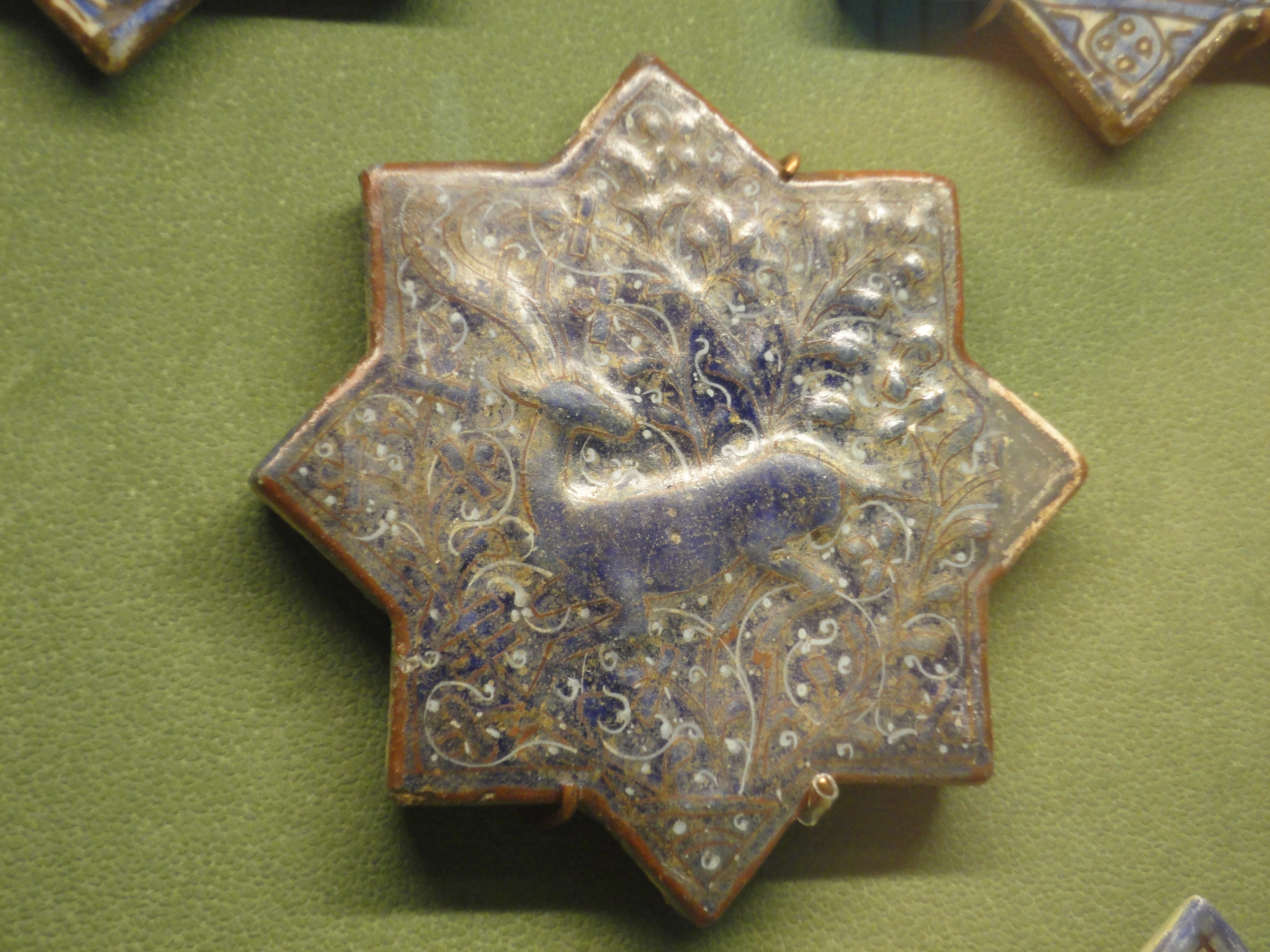 Tile, fritware, slightly moulded and painted in overglaze enamels and gilding (lajvardina ware), Iran (probably Kashan, excavated - Tehran), 14th century. Acc.# 1834:2-1876.
