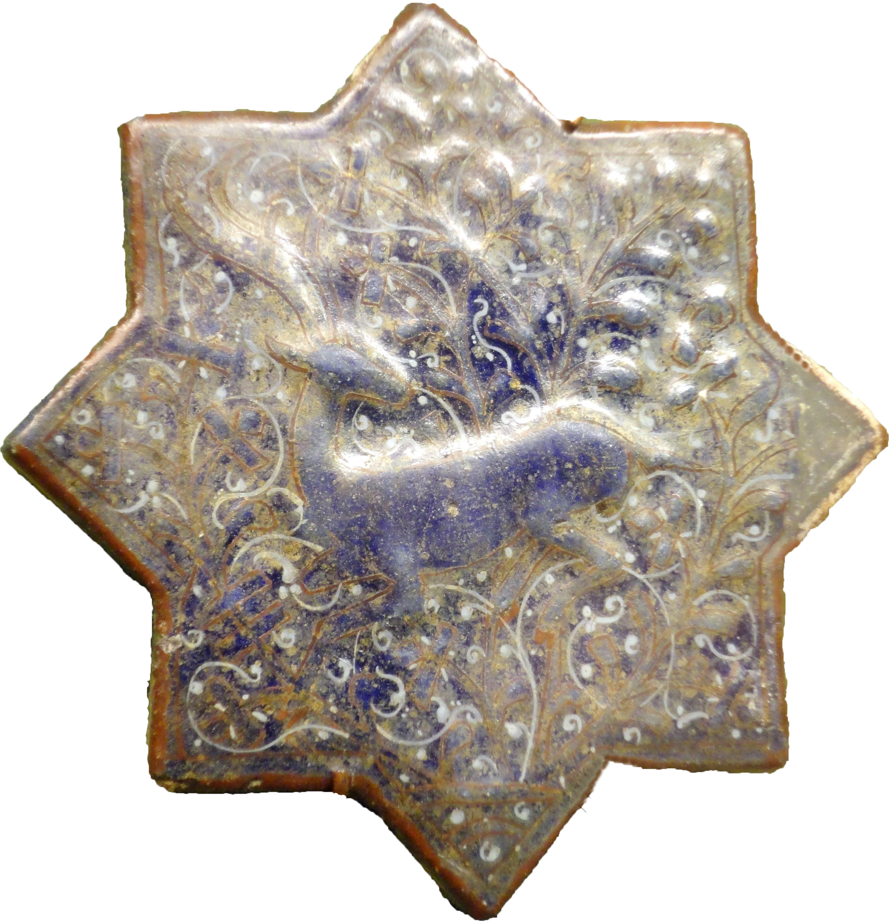 Star tile. Second half of 13th-14th century. Iran. Stonepaste; molded, overglaze painted, and leaf-gilded (lajvardina). 20 x 1.9 cm. Acc.# 20.120.73.