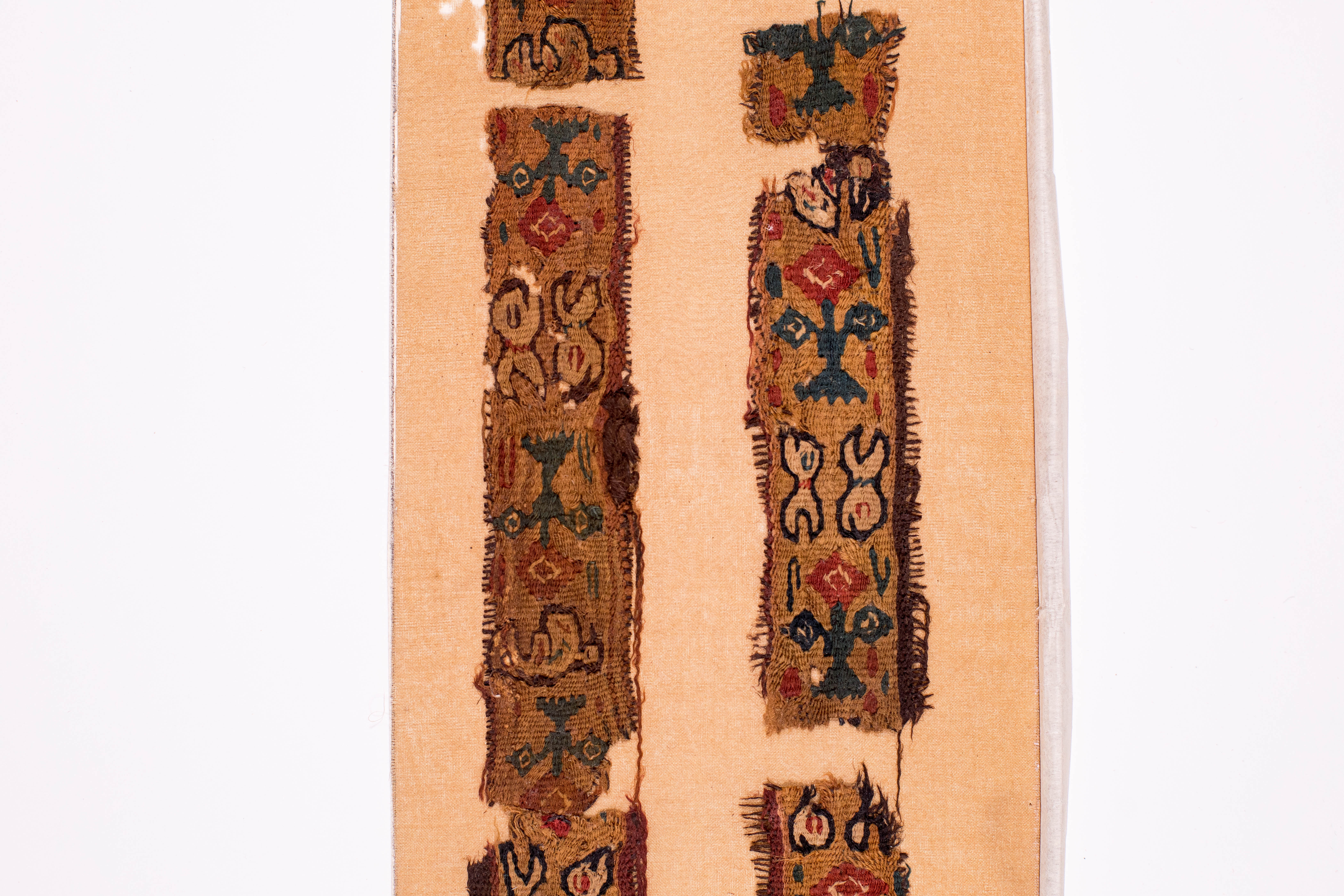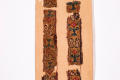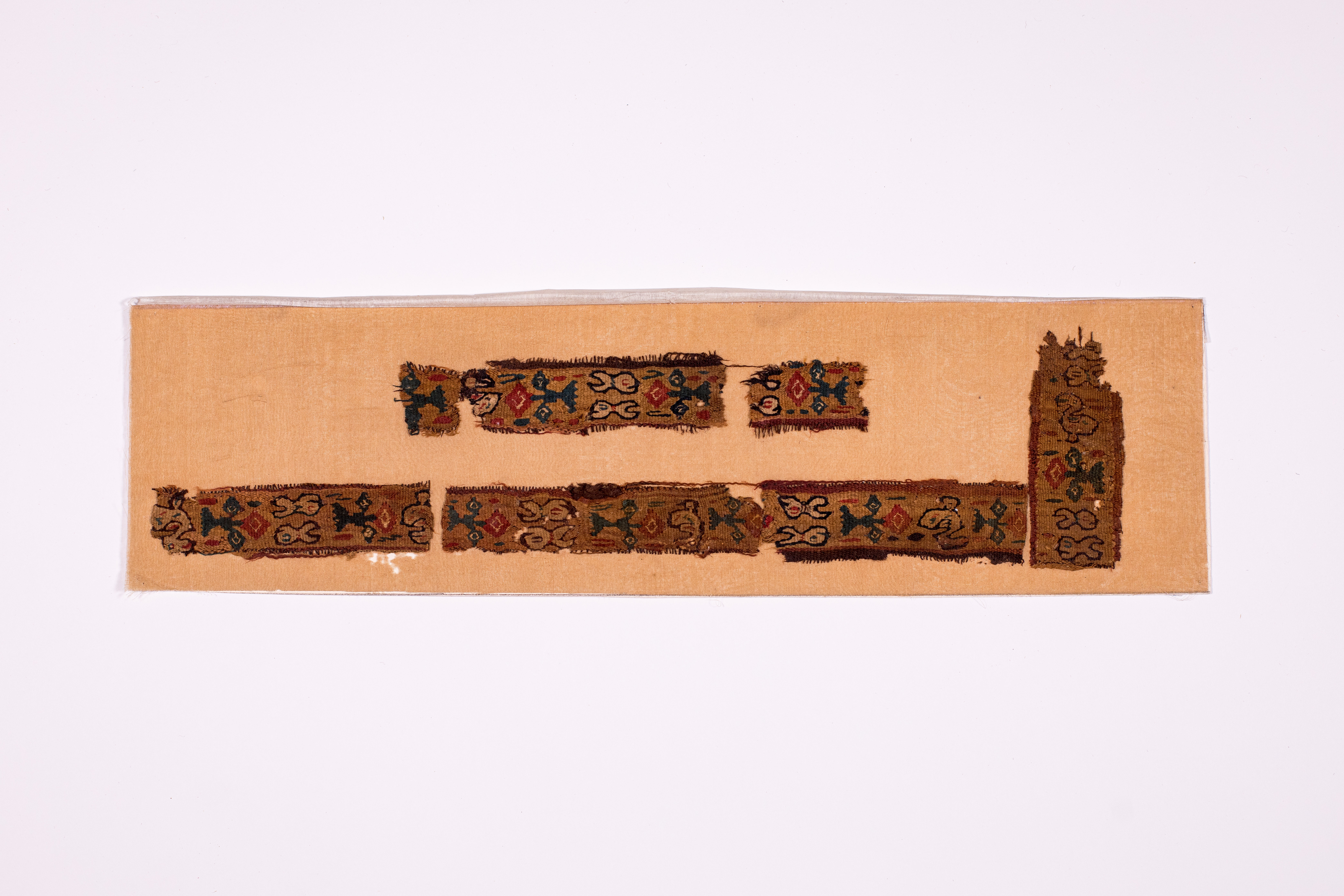 Додаток до назва (лист, ...): П’ять фрагментів коптської тканини у вигляді смуг світло-корчневого кольору із зображенням квітів, орнаментальних мотивів та птахів переважно зеленого, червоного та білого кольору./Кількість: 1