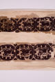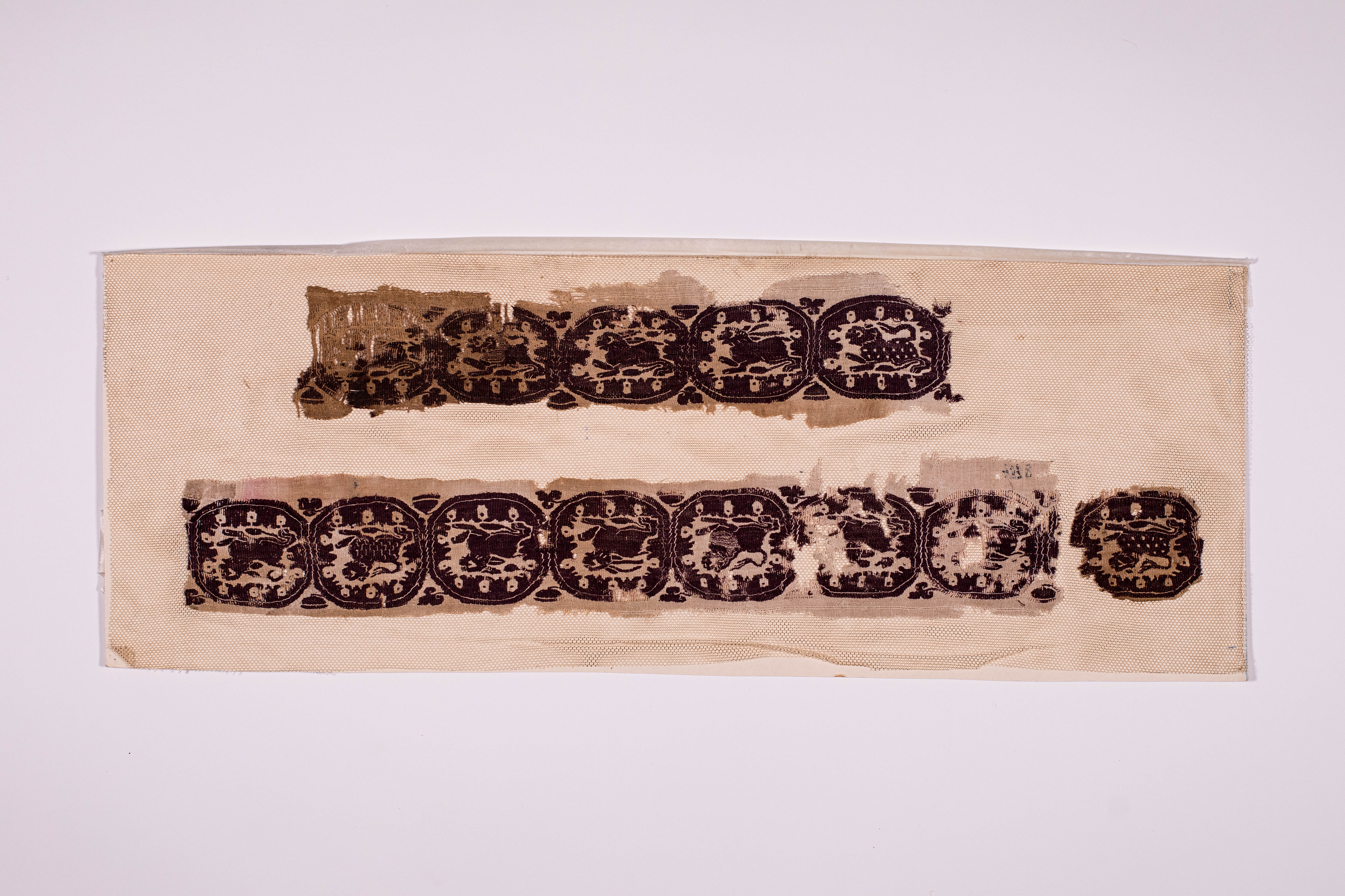 Додаток до назва (лист, ...): Три фрагмента коптської тканини з орнаментом у вигляді ряда з'єднаних один з одним темно-лілових медальйонів із зображенням тварин (зайців, левів, кіз) на білому тлі. (Дві довгих смуги та один маленький шматочок)./Кількість: 1