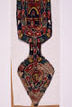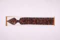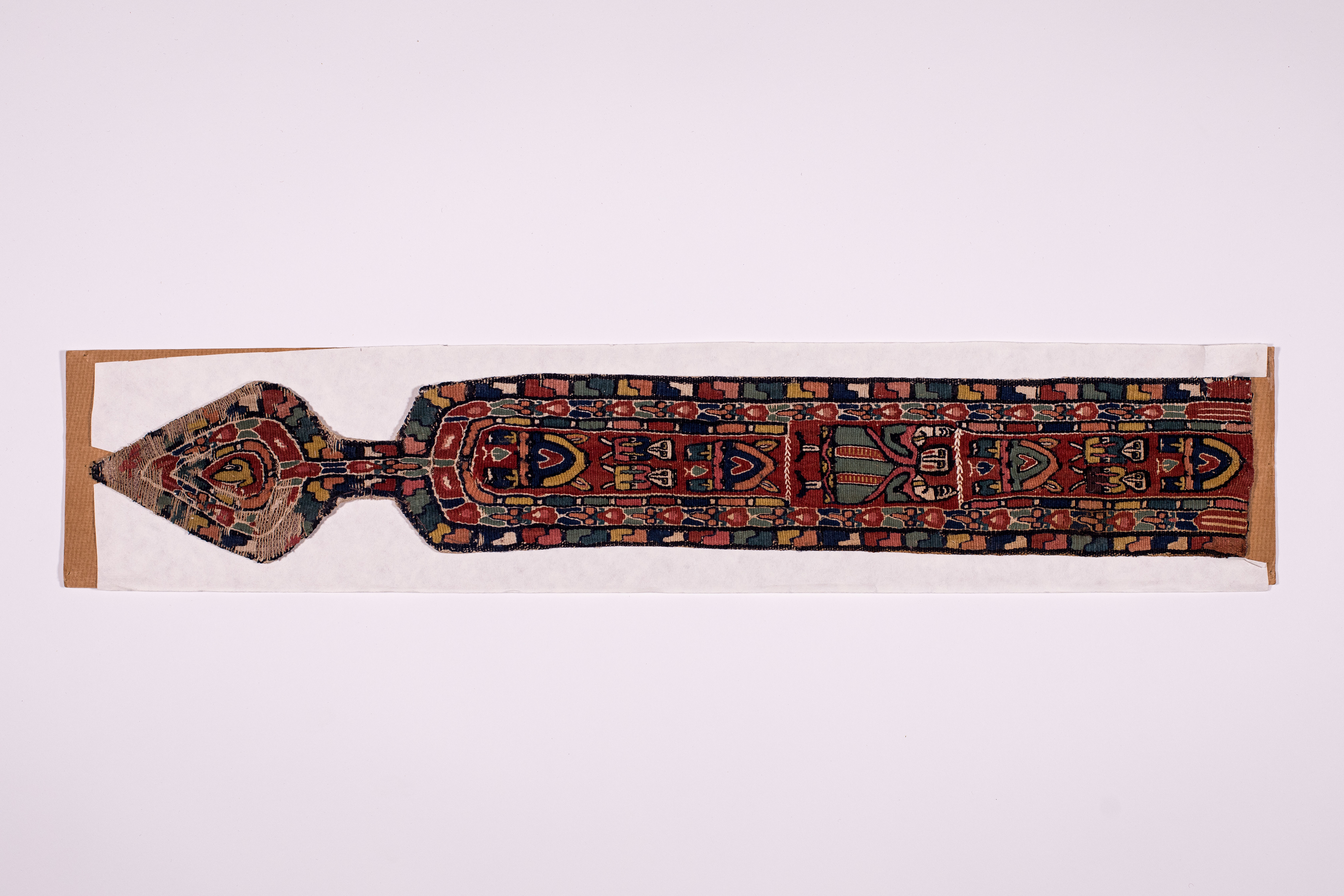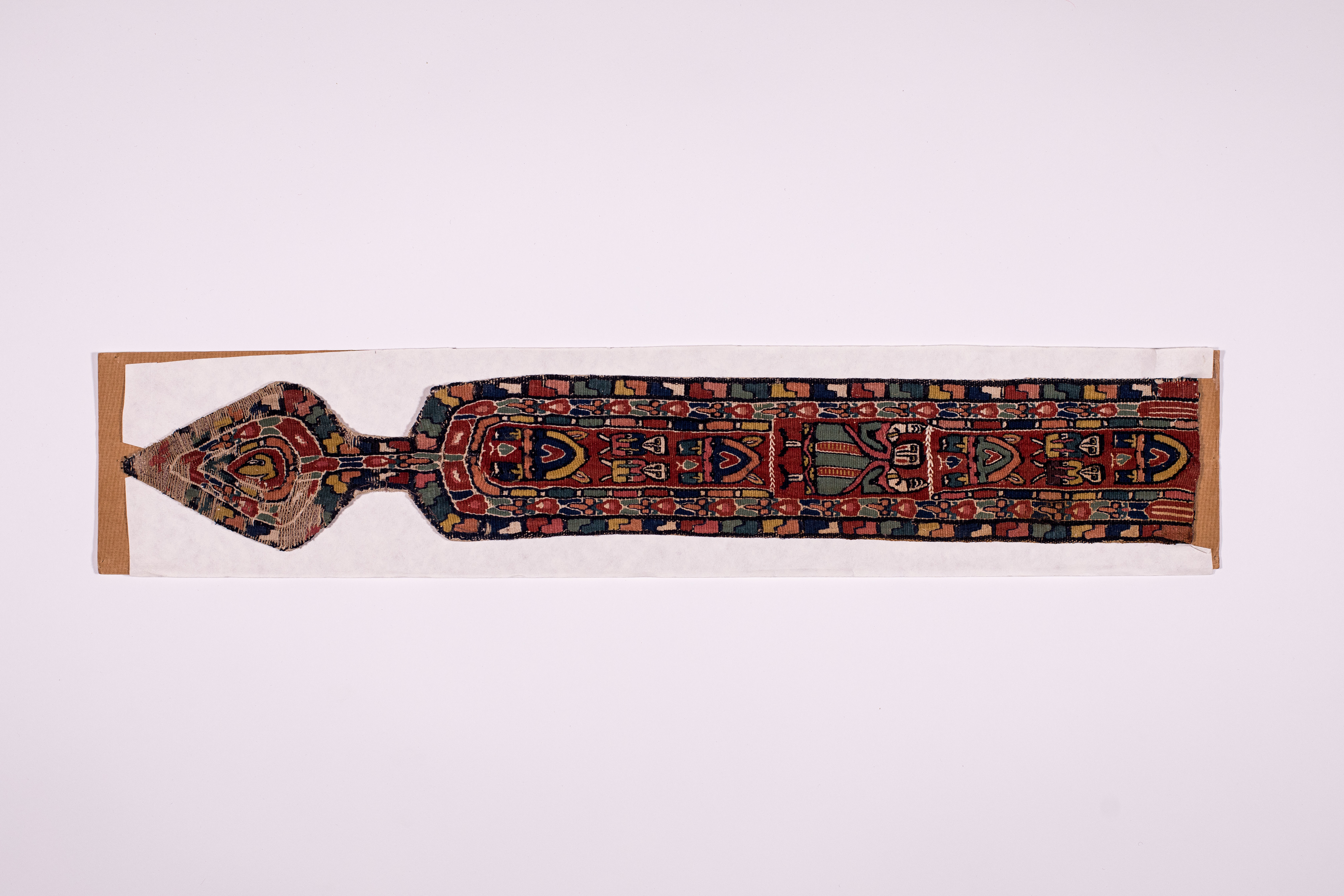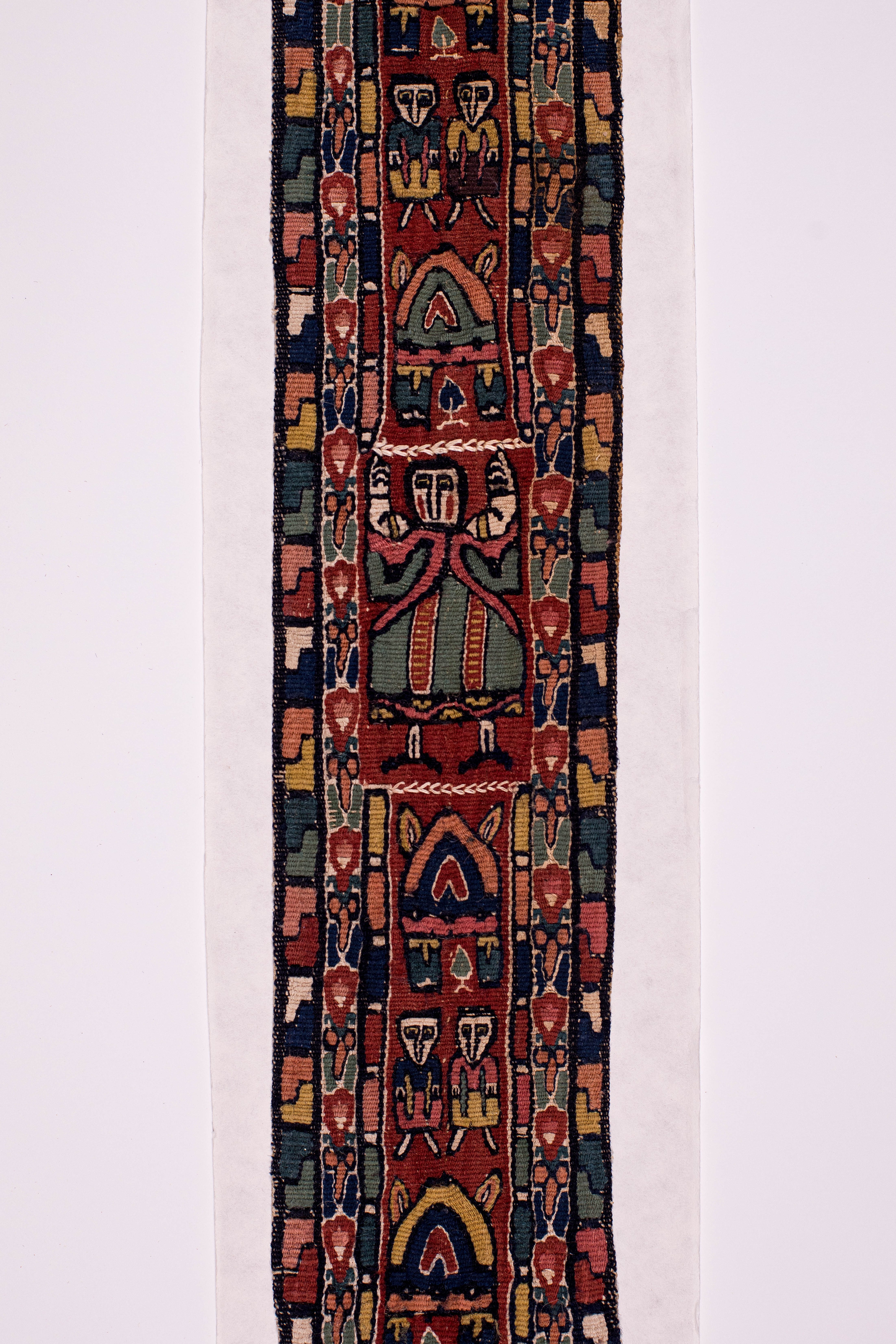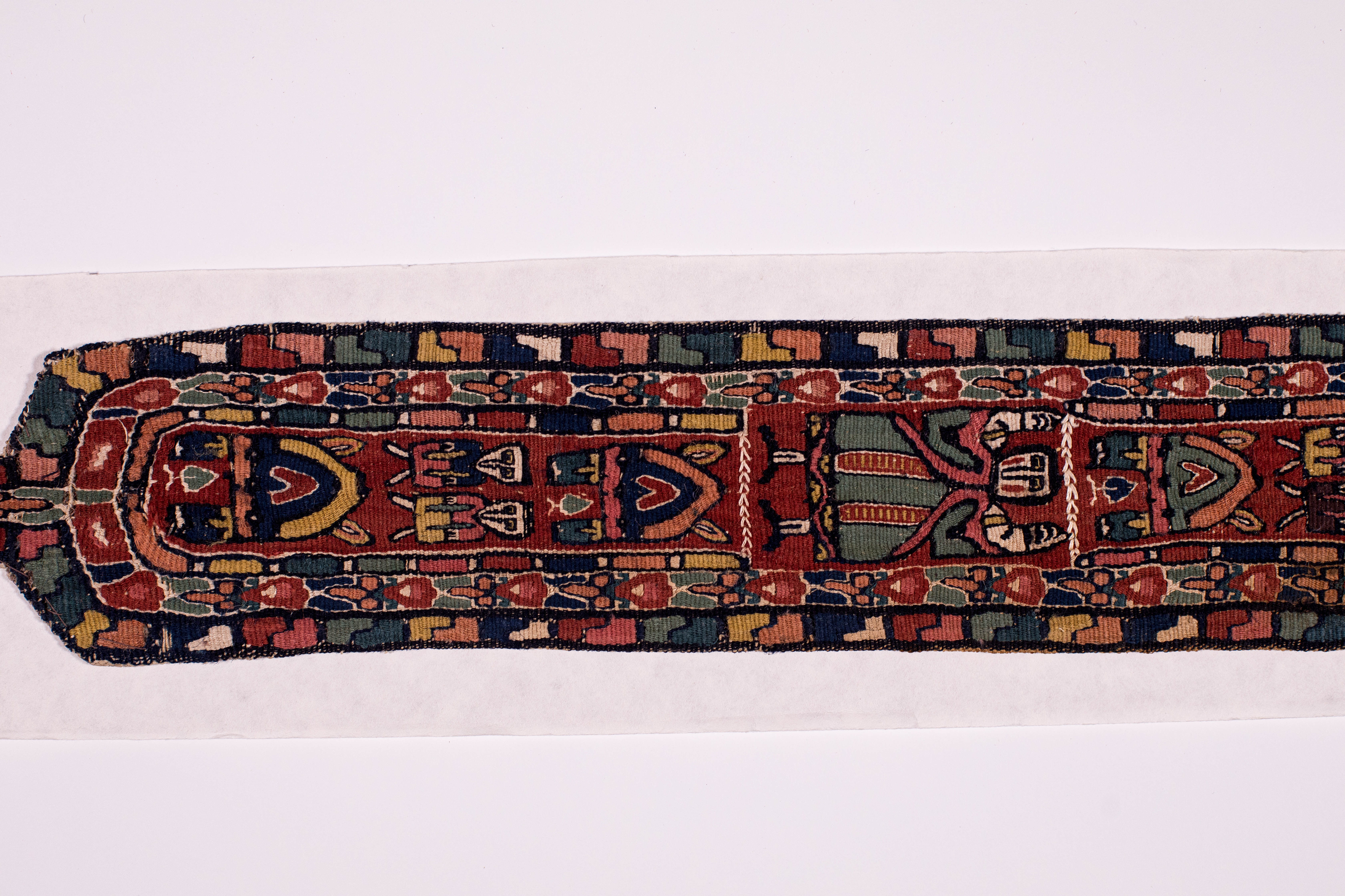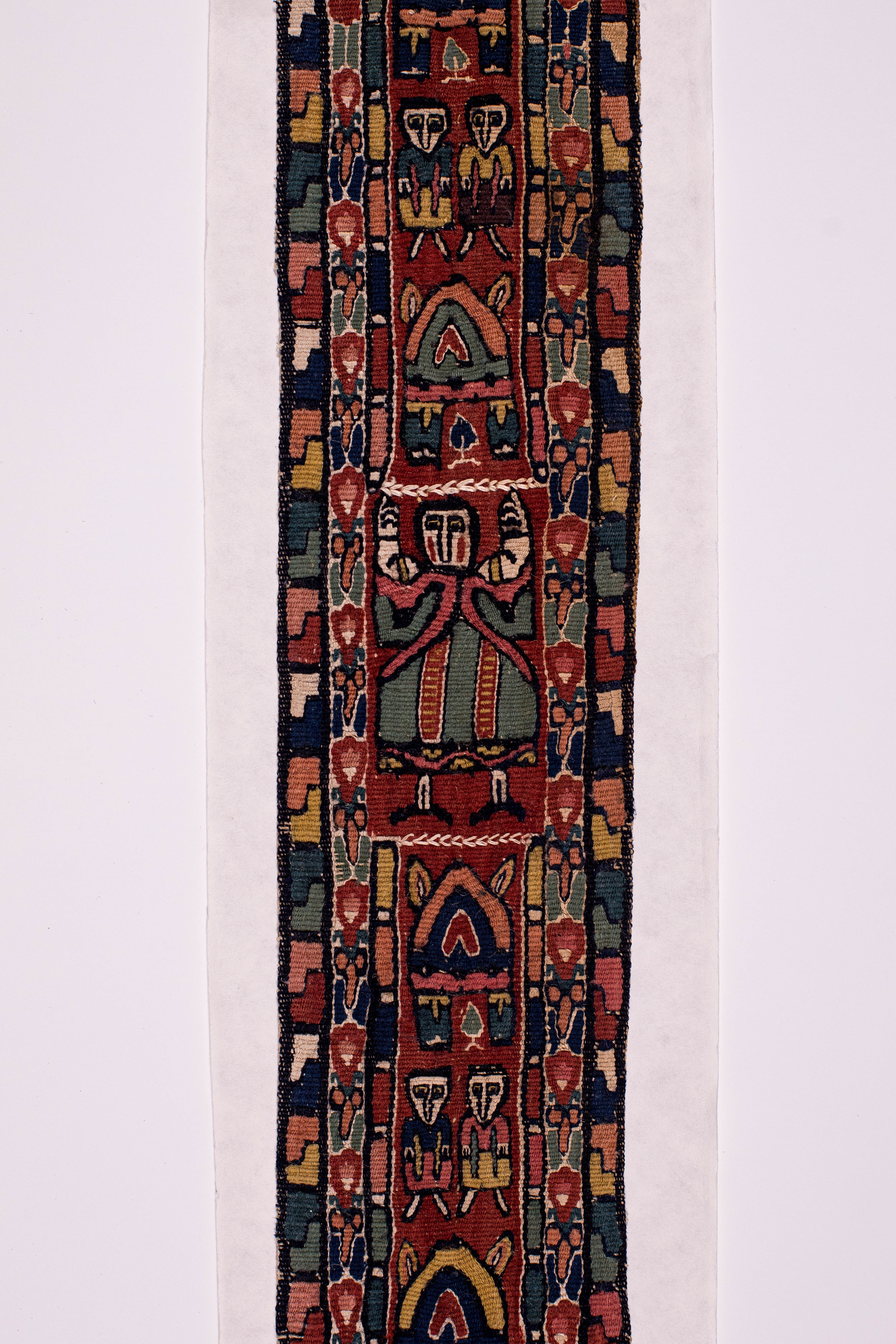 Додаток до назва (лист, ...): Фрагмент строкатої коптської тканини у вигляді широкої смуги з листеподібним закінченням. Уздовж смуги на коричнево-червоному тлі по два зображення людських фігур між аркоподібними мотивами. Посередини, у більш крупному масштабі вміщено зображенн людини у зеленому одягу. Центральна частина обрамлена двома смугами із строкатим оргаментом. Смуги з аналогічним візерунком повторюються у нижній листеподібній частині тканини./Кількість: 1