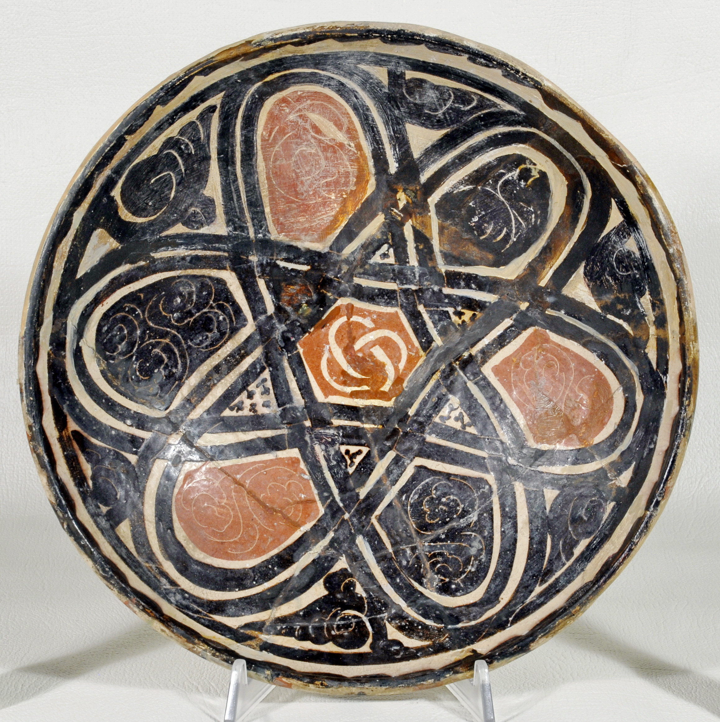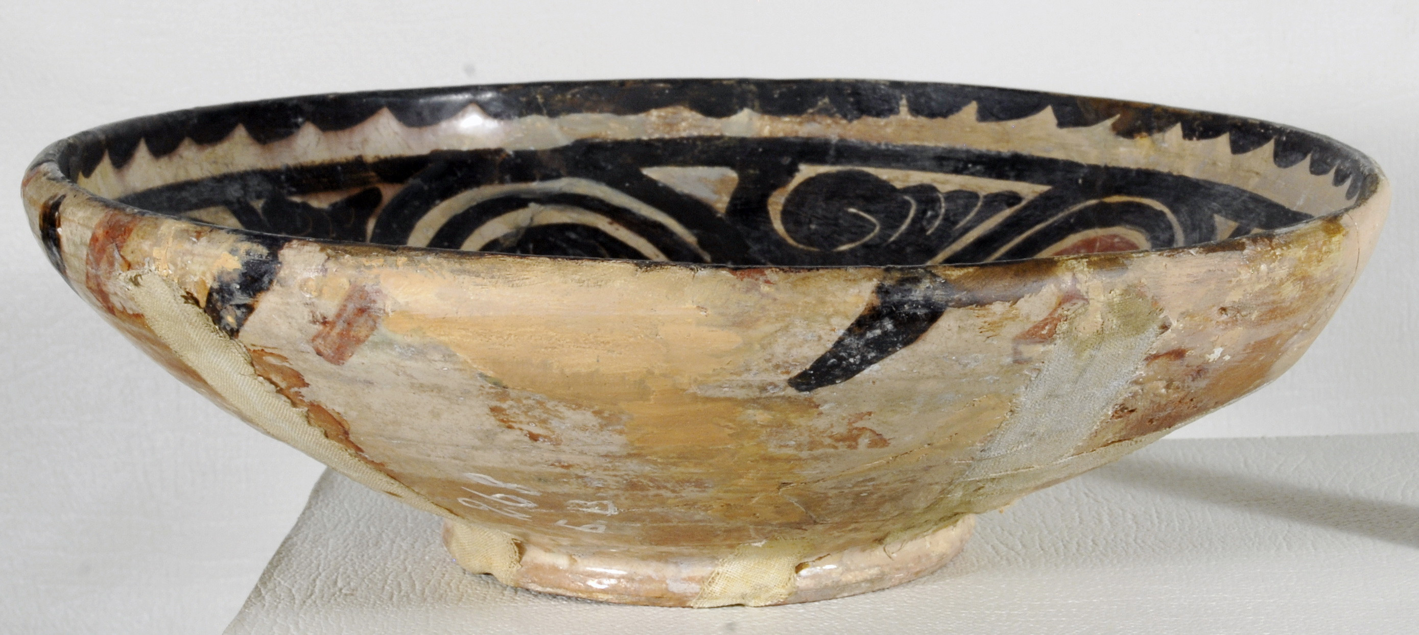 Склеєна з шматків. Догіпсована. Реставрована. Шільні пило-жирові нашарування. Склеєна з числених фрагментів. Частина борту та денце миски втрачені і грубо доповнені. Із звортнього боку шви проклеєні полотном.,