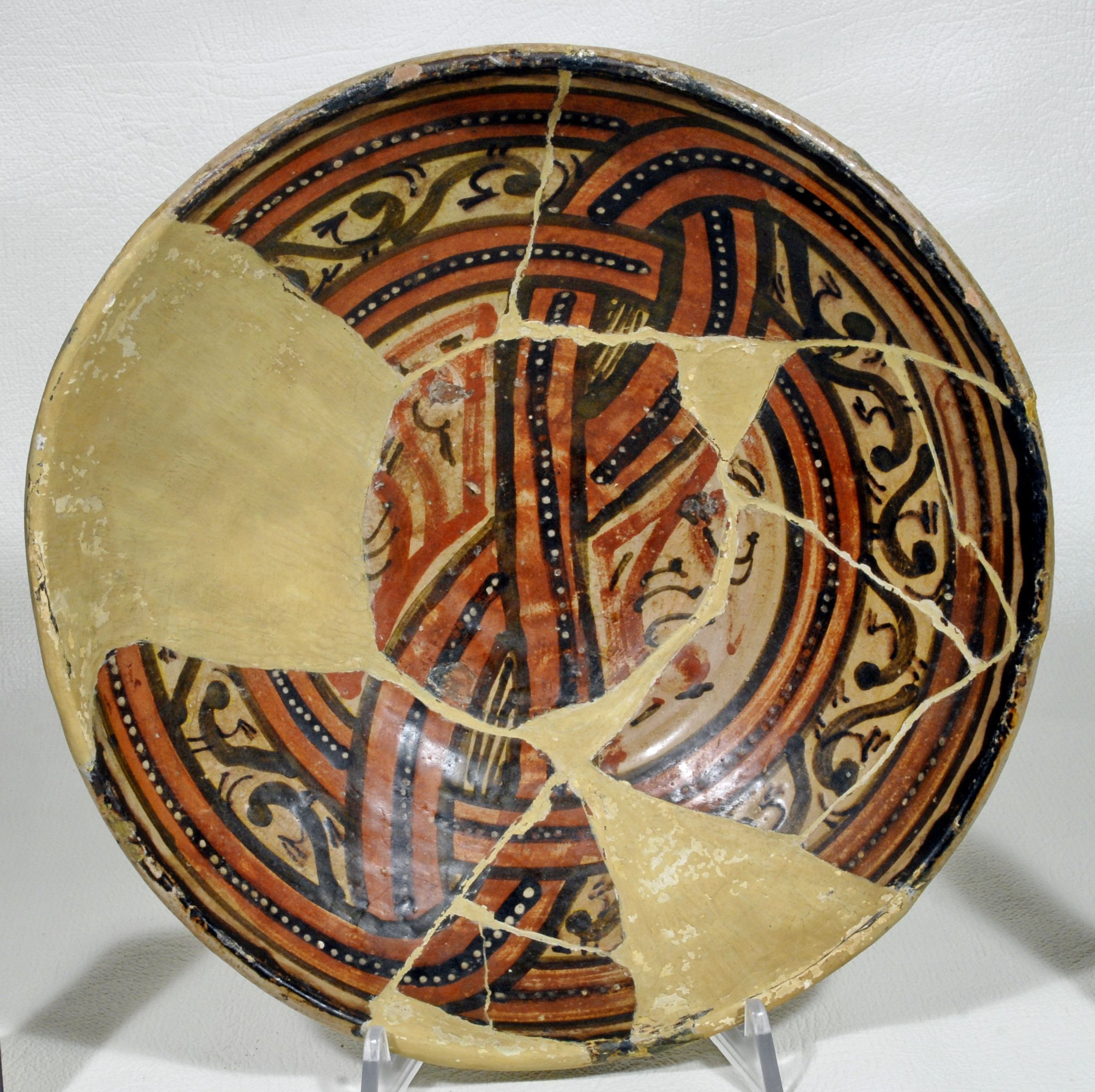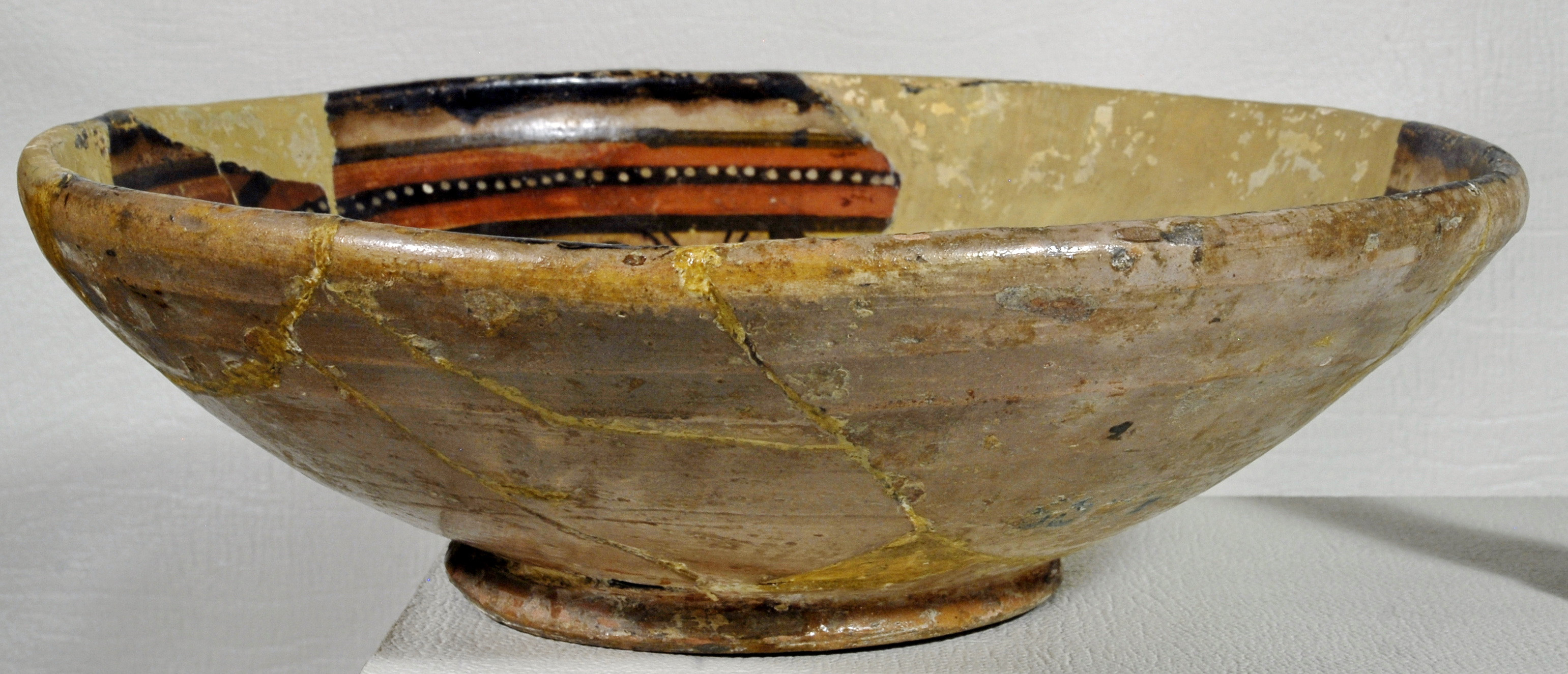 Склеєна з кількох шматків. Реставрована. Щільні пило-жирові нашарування. Склеєна з фрагментів; борт миски частково втрачно та доповнено. Денце миски деформовано. Здутини поливи; сколи по краях борту. Потребує реставрації.,