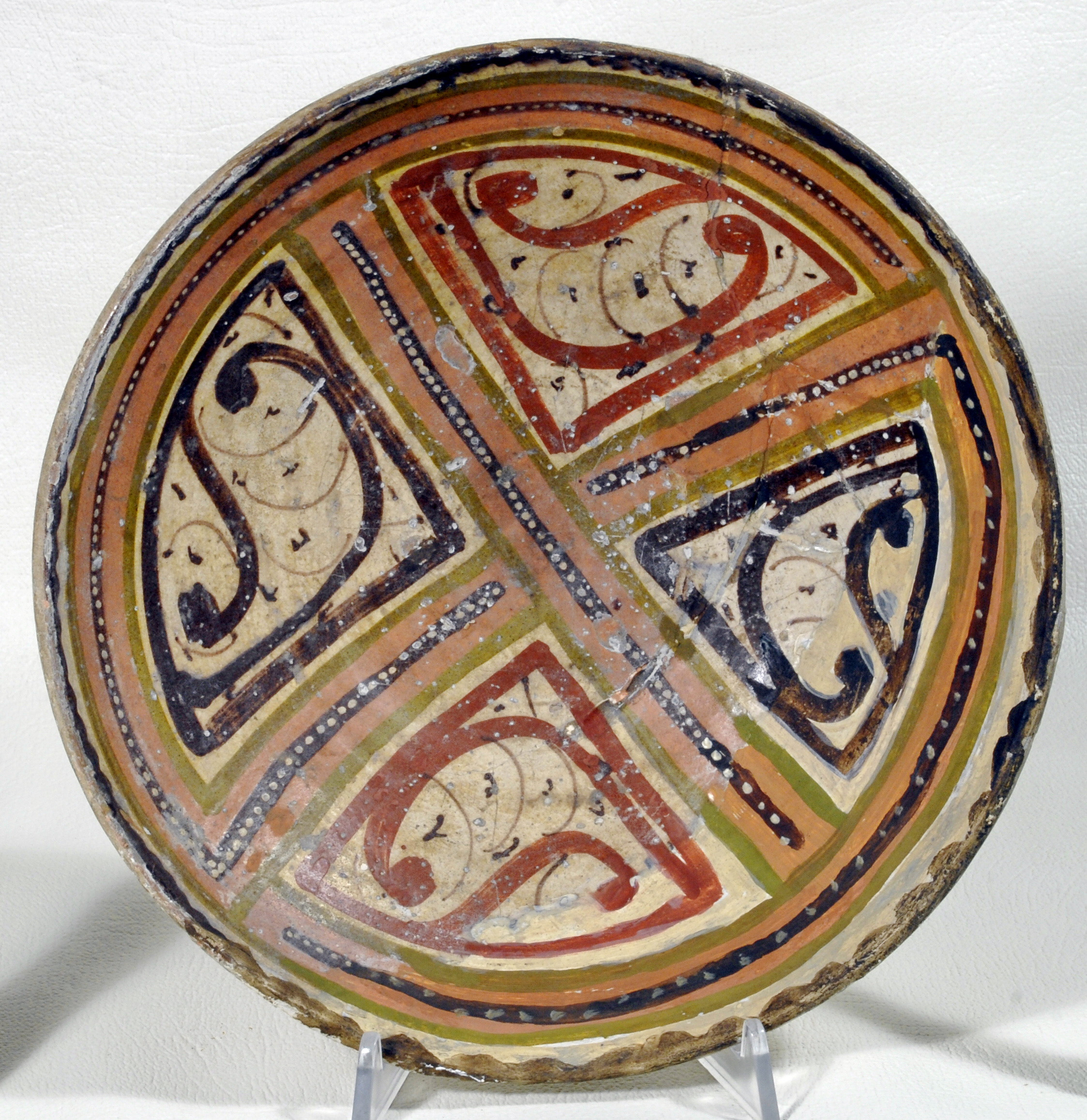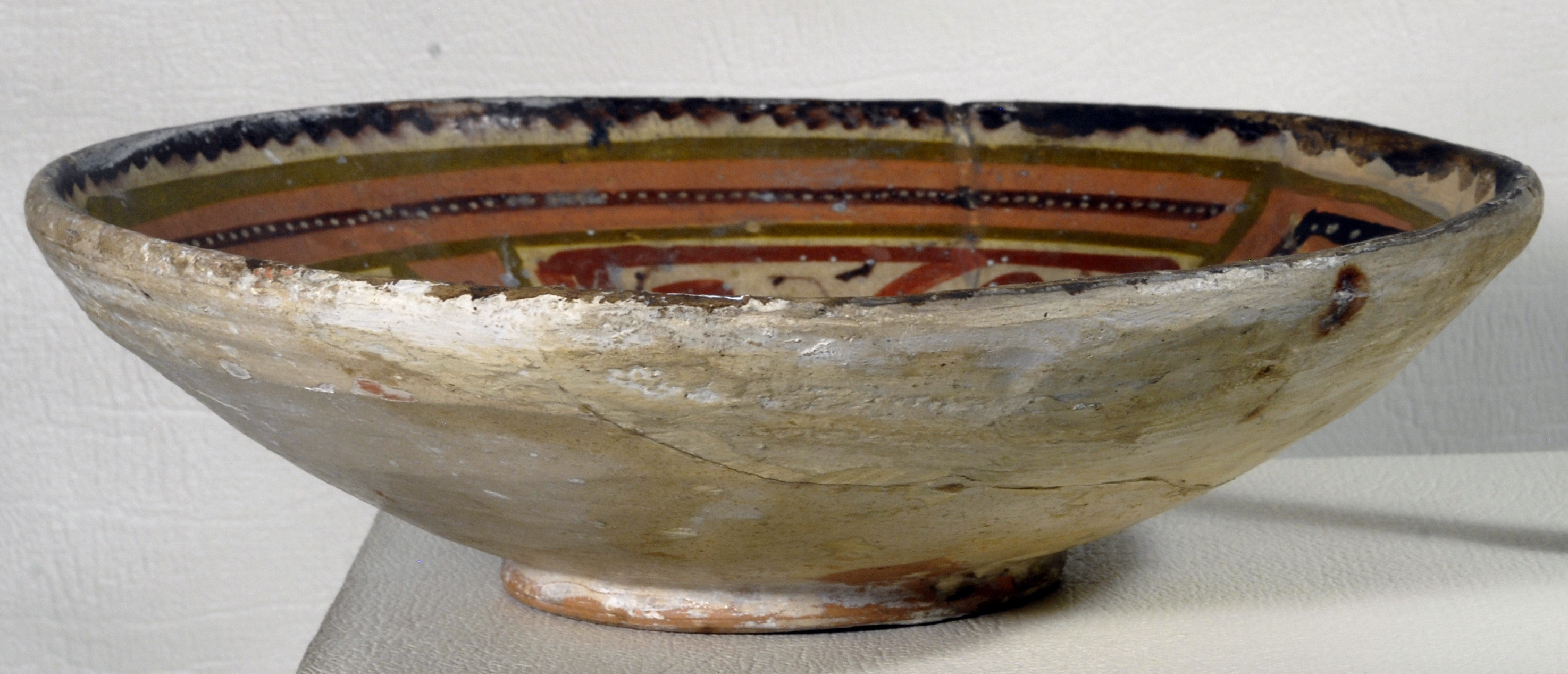 Склеєна з кусків. Догіпсована. Щільні пило-жирові нашарування. Склеєна з 3 фрагментів. Частина борту (1/4) втрачена та грубо доповнена. Шви грубо замастиковані та затоновані. Лущення та втрати поливи. Потребує реставрації.,