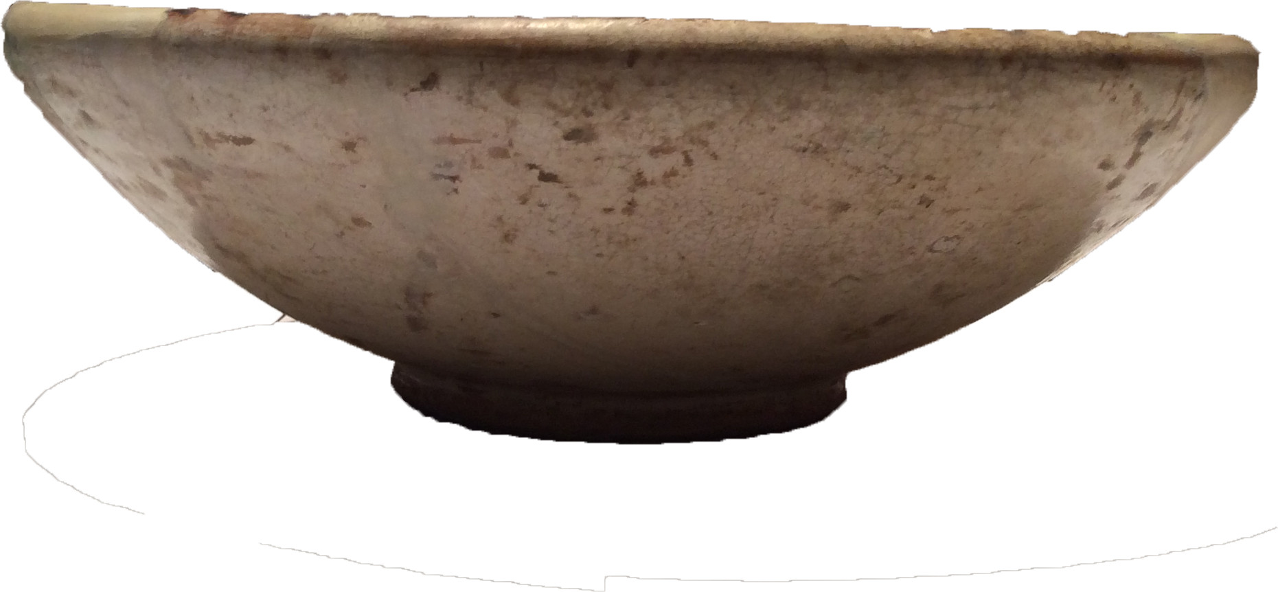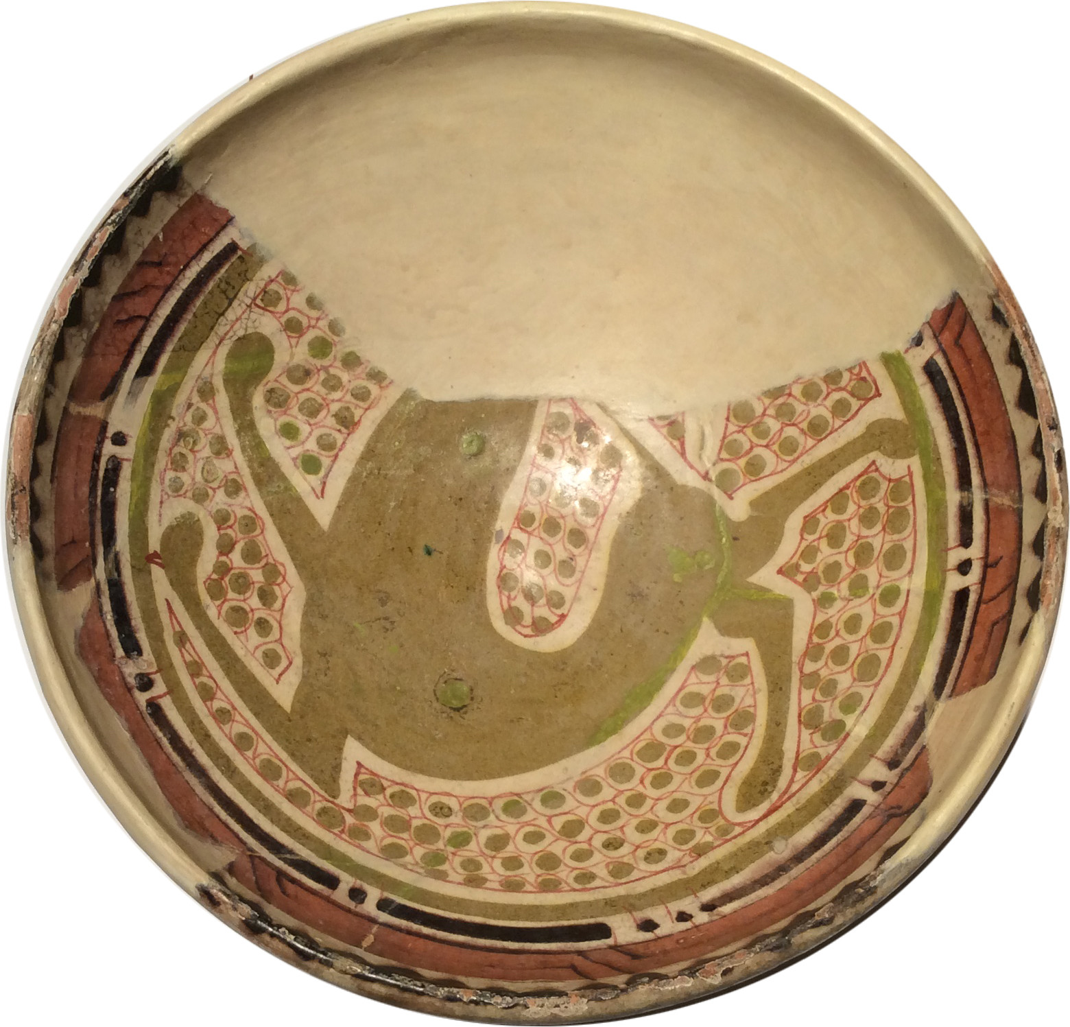 Склеєна з кусків та догіпсована.Щільні пило-жирові нашарування. Склеєна з фрагментів. Шви, мастикування та тонування виконані грубо. Окремі шви розтрізкуються. Лущення поливи та реставраційної фарби. Потребує реставрації.,