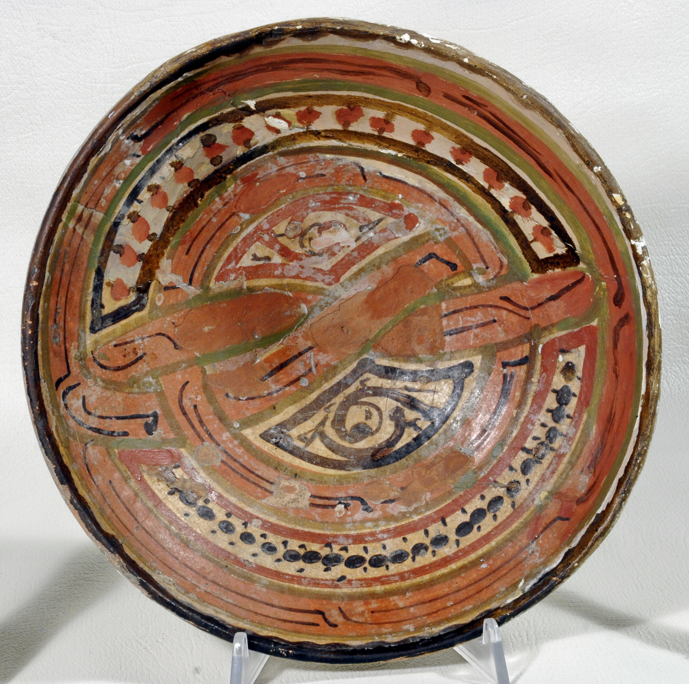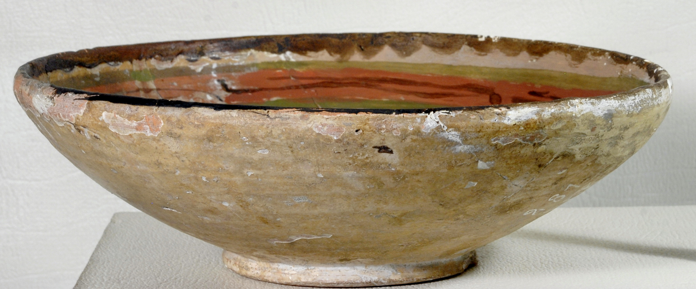 Склеєна з фрагментів. Догіпсована. Дуже потерта. Щільні пило-жирові нашарування. Склеєна з фрагментів. Спостерігається розходження швів, лущення та втрати поливи. Потребує реставрації.,