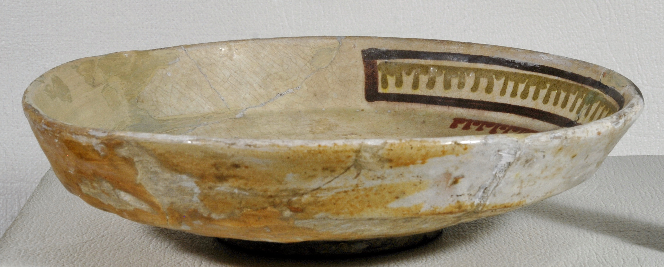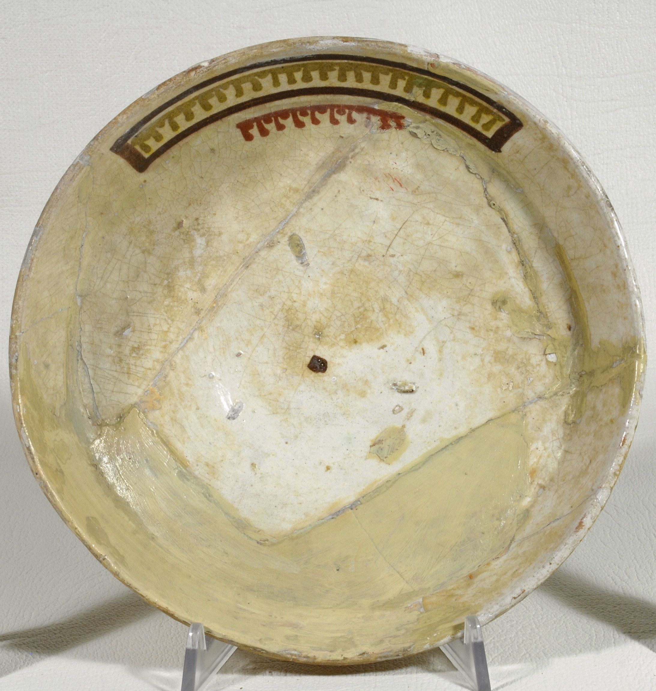 Склеєна з фрагментів. Догіпсована. Щільні пило-жирові нашарування. Склеєна з фрагментів. Частина борту доповнена. Шви та мастиковки грубо виконані. Втрати та лущення поливи. Потребує реставрації.,