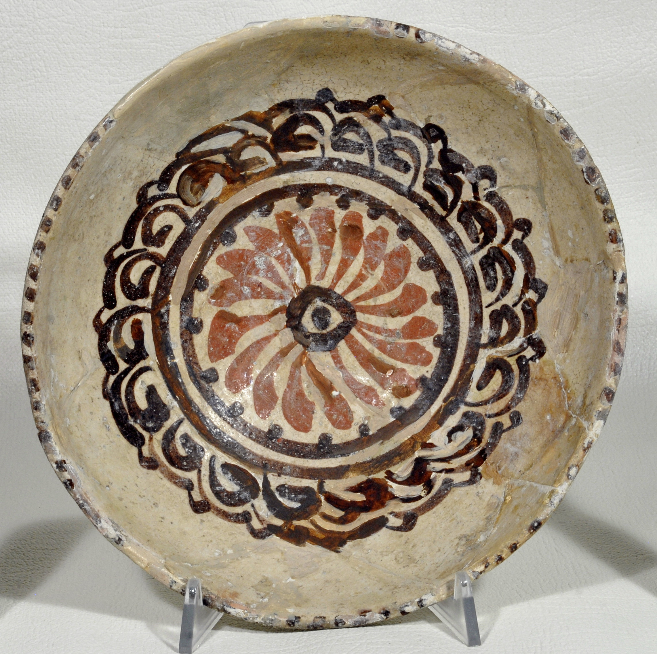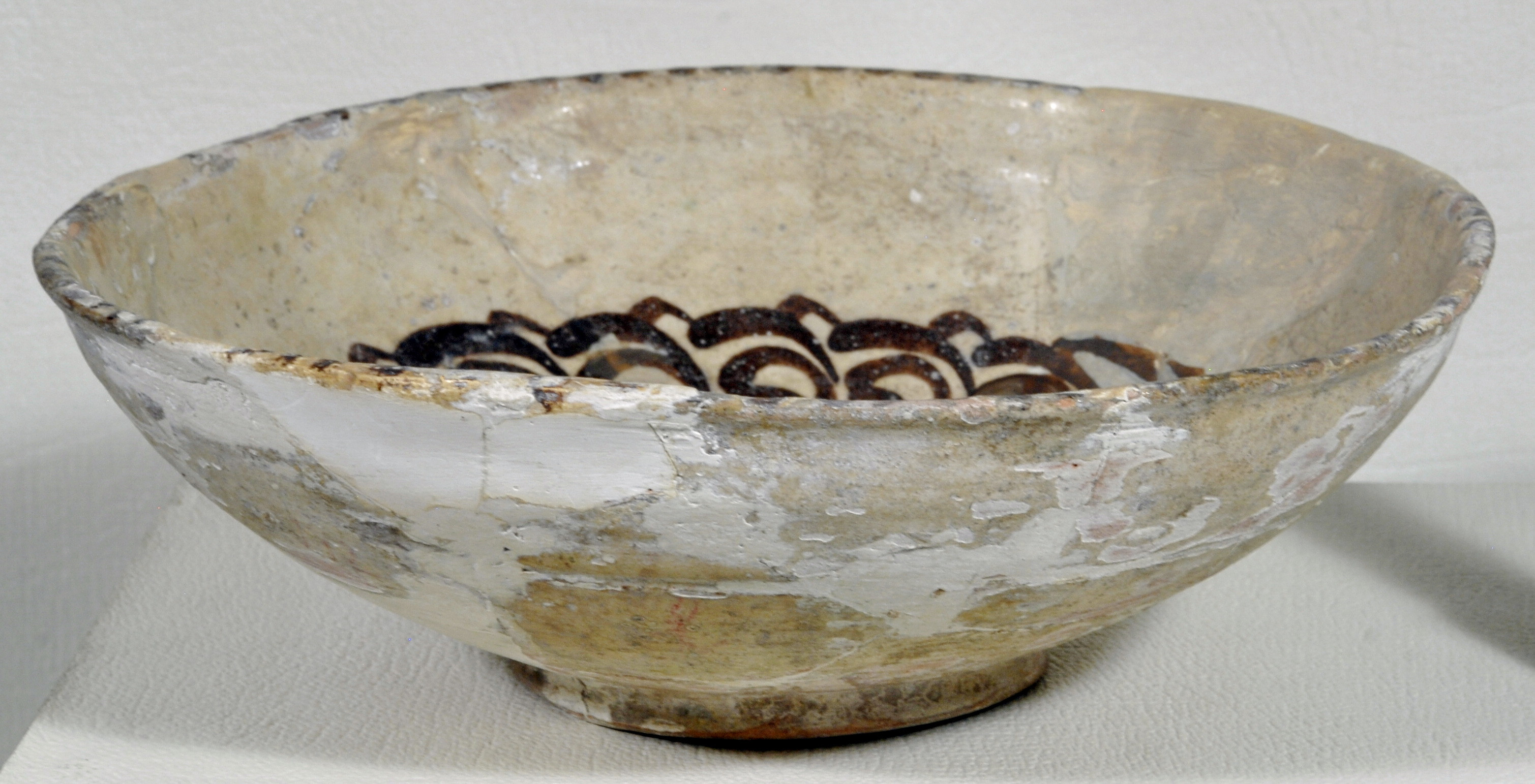 Склеєна з фрагментів. Дуже потерта. Реставрована.Щільні пило-жирові нашарування. Склеєна з фрагментів; частина борту доповнена. Тонування та склеювання грубі. Лущення та втрати поливи. Потребує реставрації.,