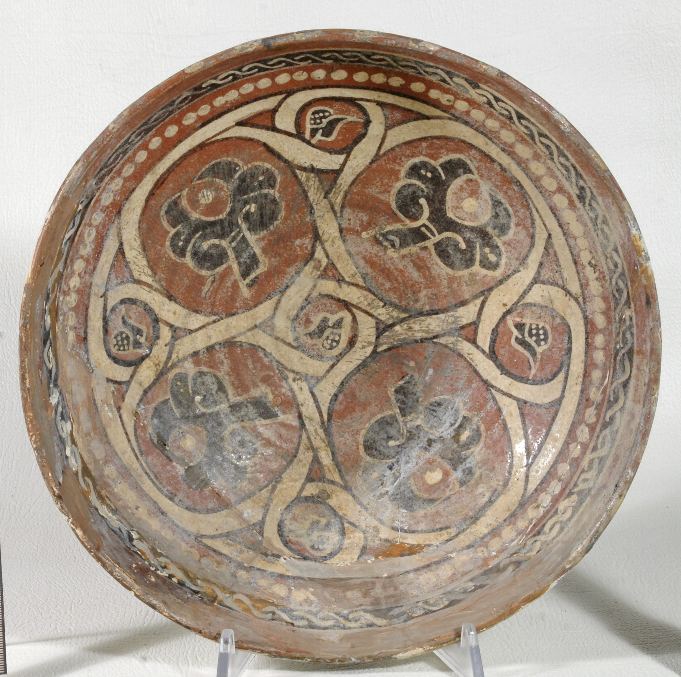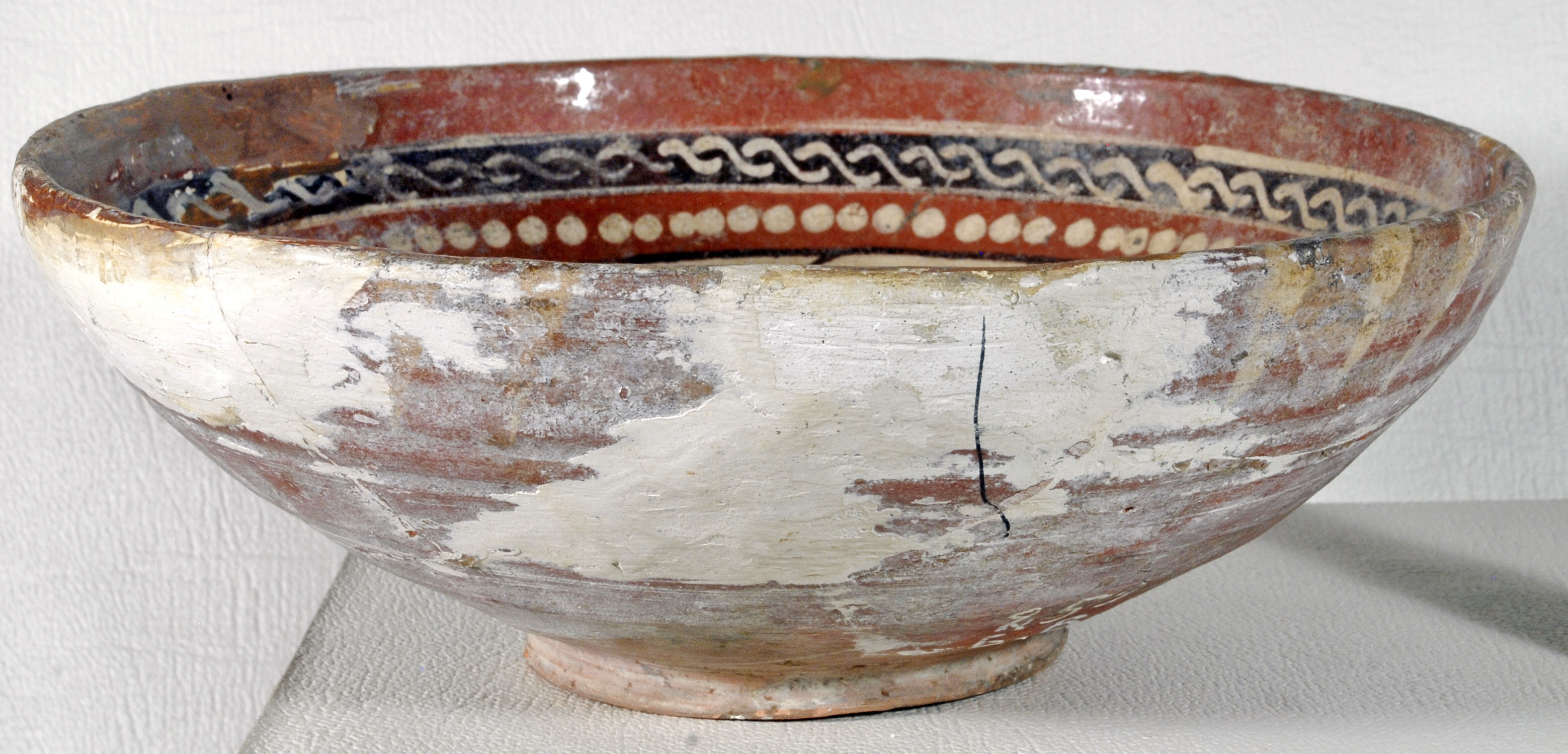 Склеєна з шматків. Догіпсована, реставрована. Щільні пило-жирові нашарування. Склеєна з фрагментів. Частина борту доповнена; шви та мастиковки грубо виконані. Полива вкрита білісним нальотом, є незначне лущення. Потребує реставрації.,