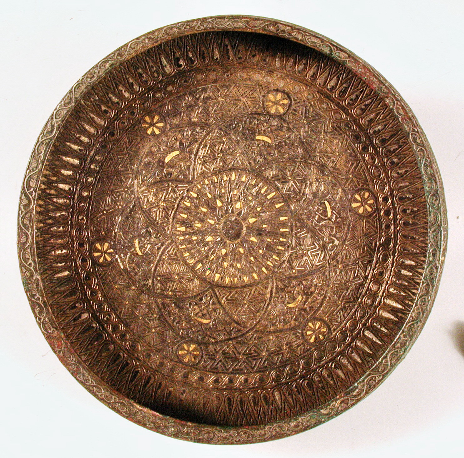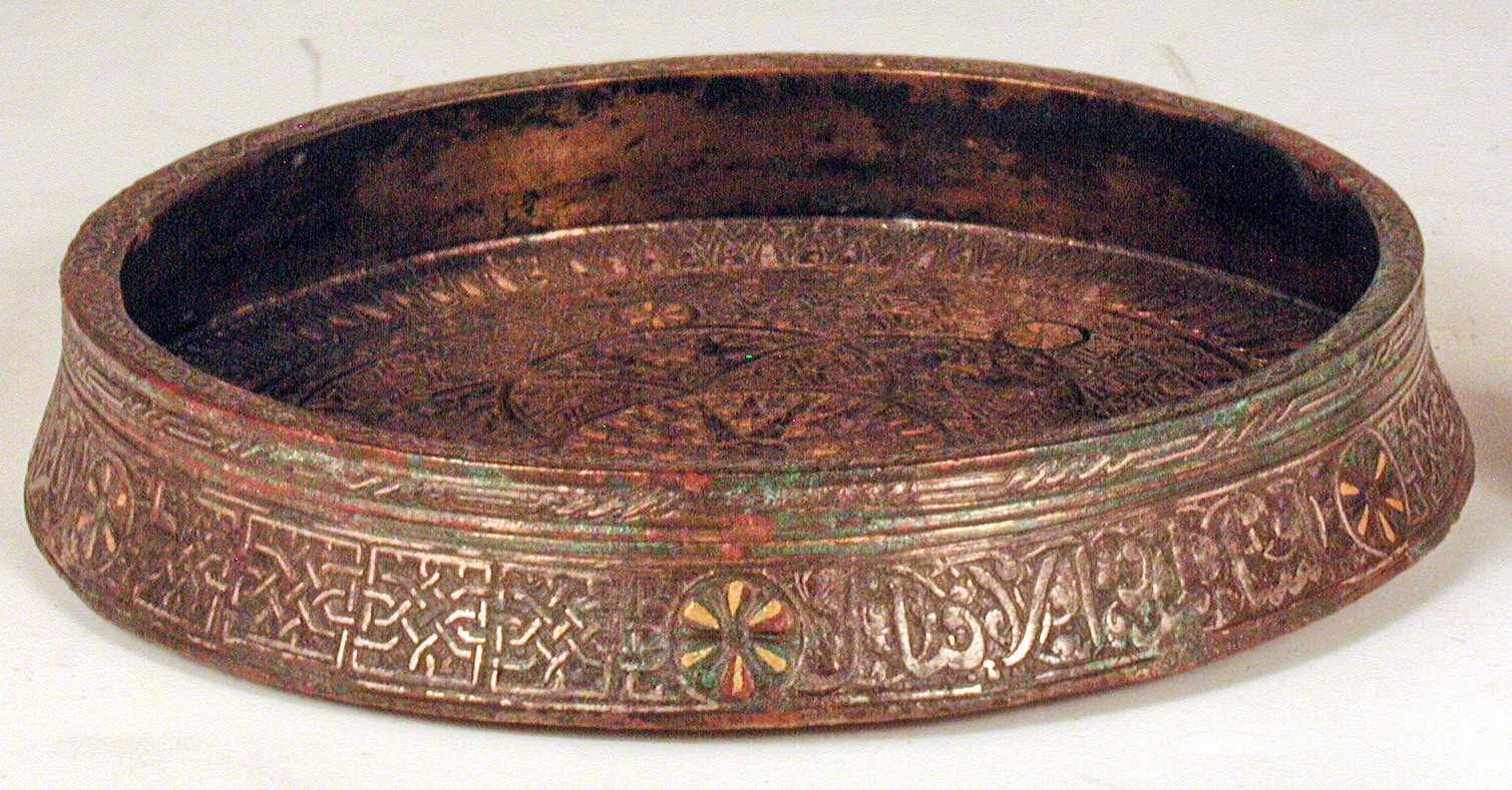 A Seljuk bronze dish, Khorasan, Iran, ca. 12th century AD. with central human headed winged feline creature and bands of inscription around the rim.