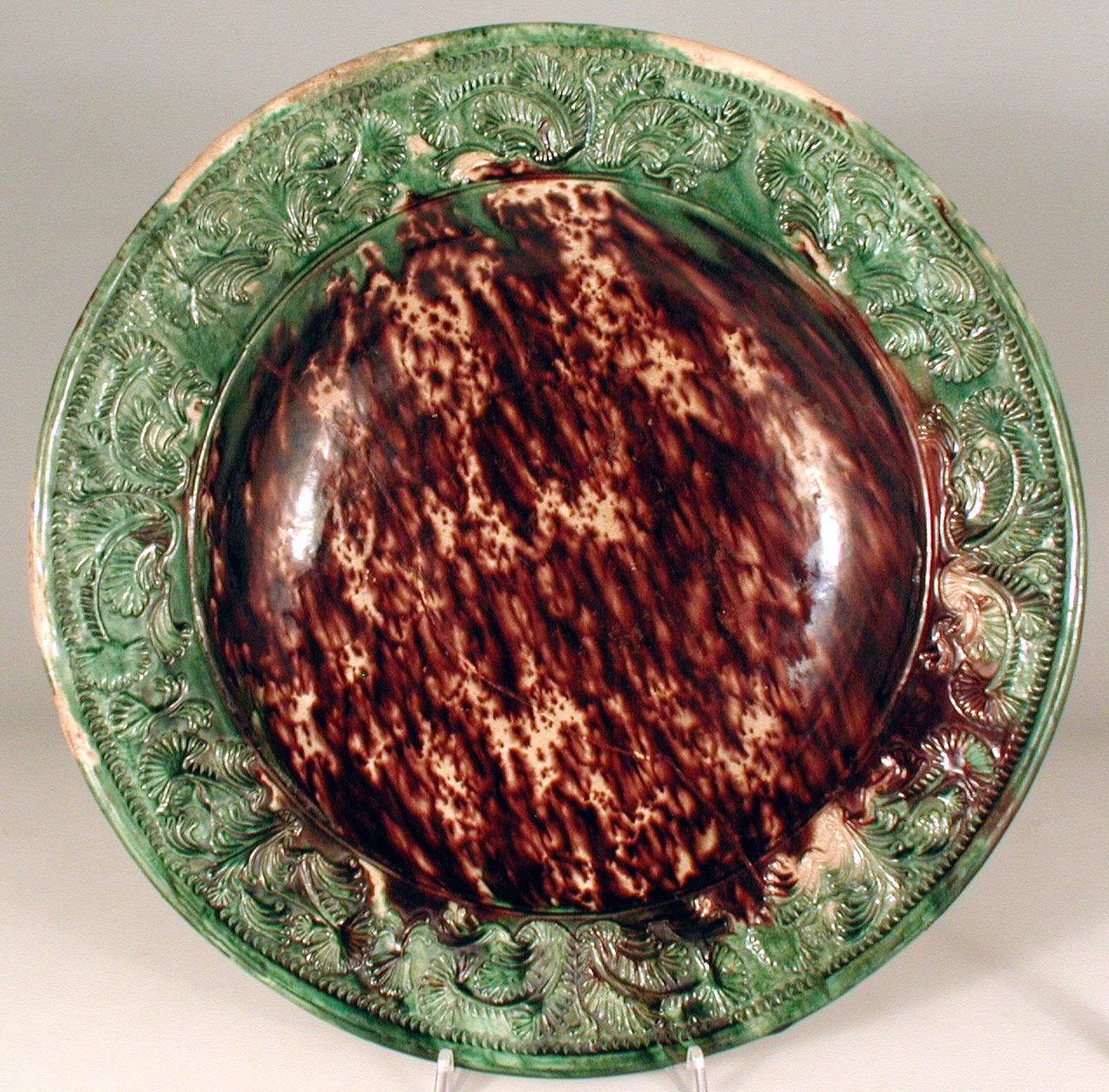 Закладка “Атрибуція” - Наим. предмета, издания: Таріль/Змiн.додаток до назва (лист, ...): Таріль поливаний з рельєфним декором/Змiн. час створення: XIX ст.місце створення, школа: с. ІспікНовый материал: керамікаНовый материал: зелений барвник (сполуки міді)Новый материал: фіолетовий барвник (сполуки марганцю)Новый материал: поливаИзм. техника: Штампований малюнок, нанесений штампом-формоюИзм. техника: полива