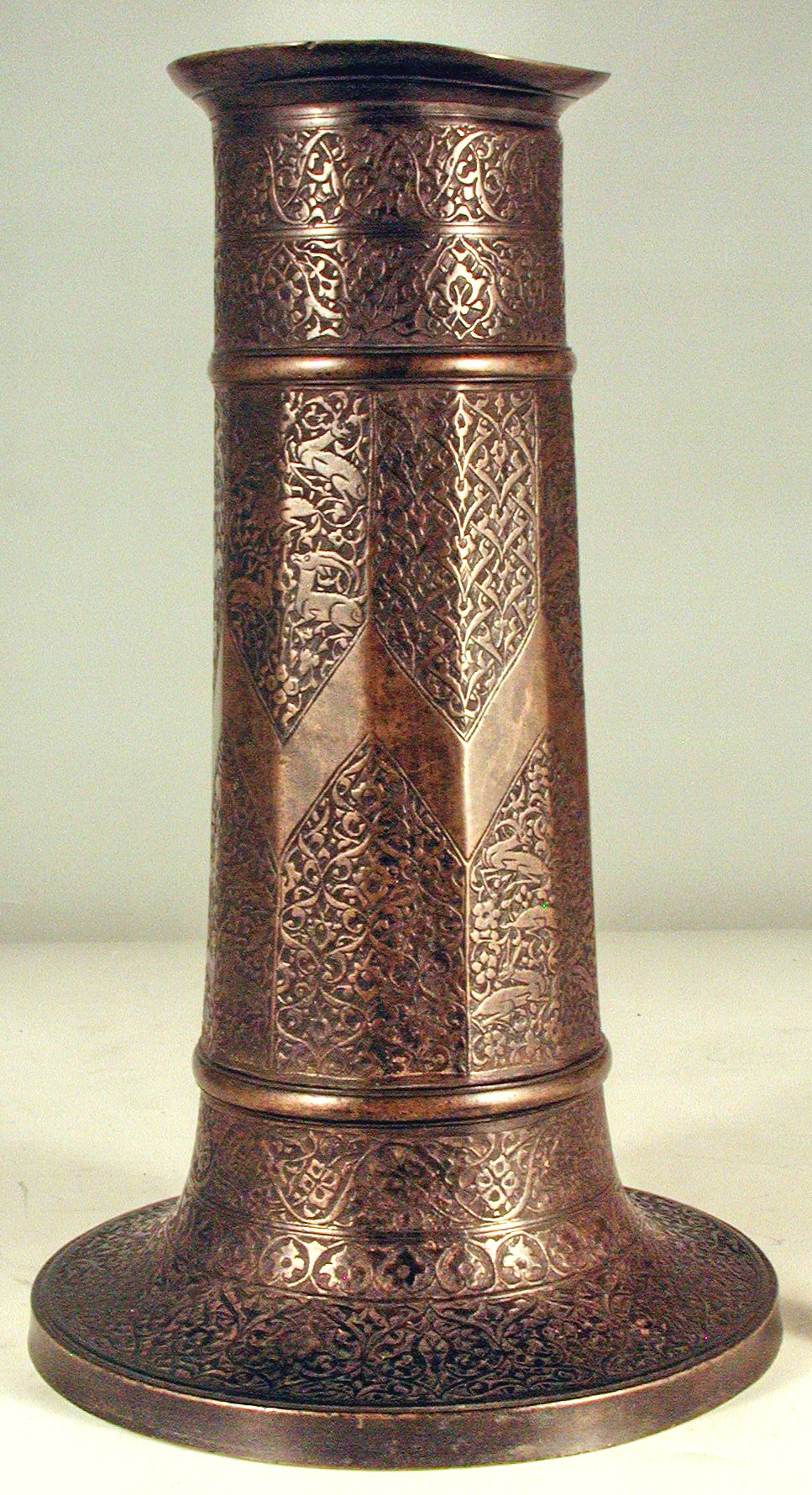 The above verse from a poem by the famous Iranian poet Sa‘di (died 1291–92) is commonly found on candlesticks (sham‘dans) of the Safavid period (1501–1722), including the upper band of the Aga Khan Museum candlestick shown here. The symbolic comparison between the mystic lover seeking the Divine and the moth yearning for the flame finds a natural home decorating lighting devices. Also typical of candlesticks from the Safavid period is split-palmette design on a cross-hatched background, here in an overall pattern that seems to rise along the ridges of the body. The overall floral scroll is interrupted by a six-lobed cusped arch chevron, which seems hidden in the densely engraved foliage.