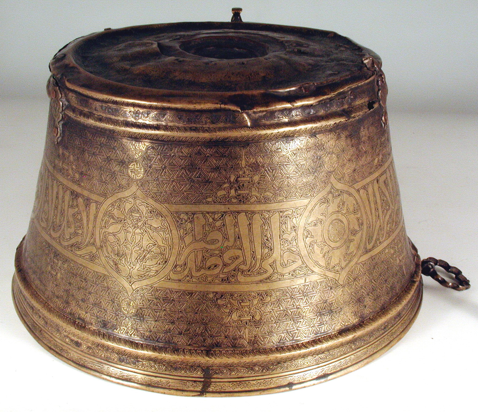 "Mimma ' umila birasm al-ganab al-karim al-ali al-maulawi al-amir al kabiri al agalli al 'aduli an nasri l-akmal al-amha al-as-'adi al..." / "З того, що зроблено за наказом сторони гідної високої, господина еміра великого, найславетнішого, помічника, порадника, довершенішого (?), щасливішого..."/Змiн. час створення: кінець 14 - початок 15 ст.місце створення, школа: СиріяНовый материал: мідний сплавПериод: доба МамлюківИзм. техника: куванняИзм. техника: карбуванняИзм. техника: інкрустація срібломИзм. техника: гравіруванняИзм. техника: клепаннямісце створення, школа: Єгипет