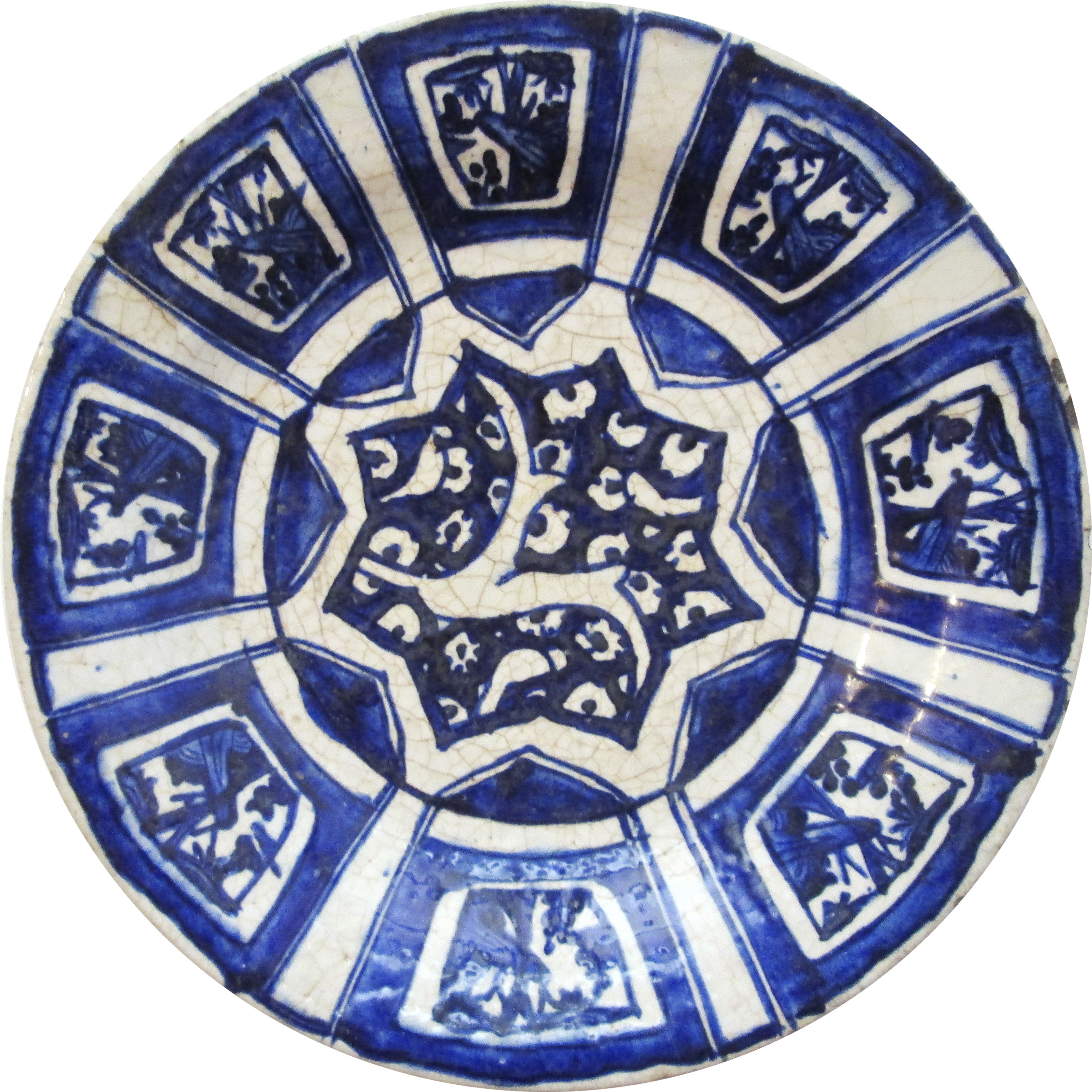 The most popular Chinese designs are found on kraak (the Dutch approximation of “carrack,” referring to the type of Portuguese ship that first brought this porcelain to Europe; see, e.g., Pope, p. 136) ware. The blue-and-white dishes often have brown rims; the usual organization of the surface consists of eight panels encircling a central composition containing a seascape (Plate xlii) or a landscape with decorative motifs including baskets, lotus sprays, birds, insects, deer, and a variety of misunderstood Buddhist symbols. Panels in kraak ware with sketchy painting and dark-gray coloring were still popular toward the end of the Safavid period