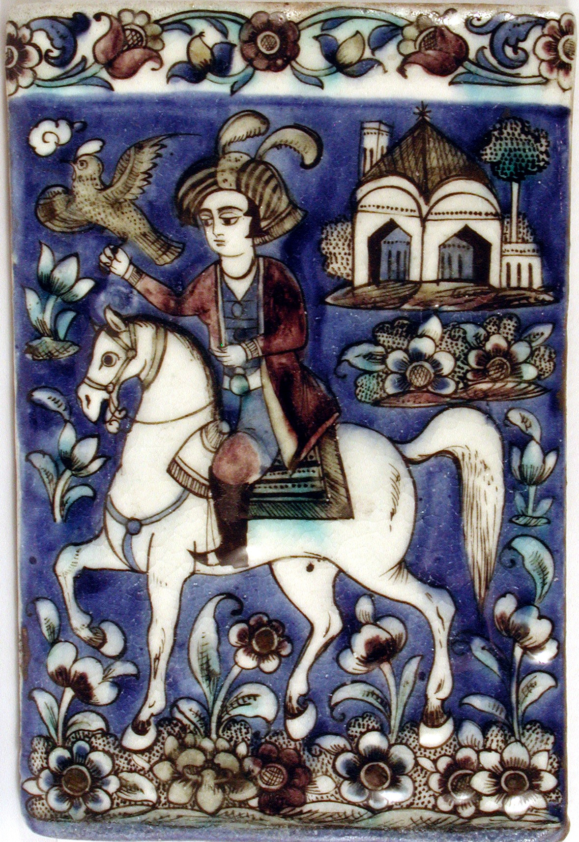 Rectangular underglaze tiles were commonly made in nineteenth-century Iran to decorate the upper borders of architectural interiors in a continuous frieze. Production of these tiles was centered mainly in the Qajar capital of Tehran. The underglaze technique of painting, applied on either a flat surface or molded in relief, facilitated the creation of scenes reminiscent of painting on paper and constitutes one of the distinguishing characteristics of Qajar tilework. In this tile, a young man on horseback is depicted against a lush landscape background.