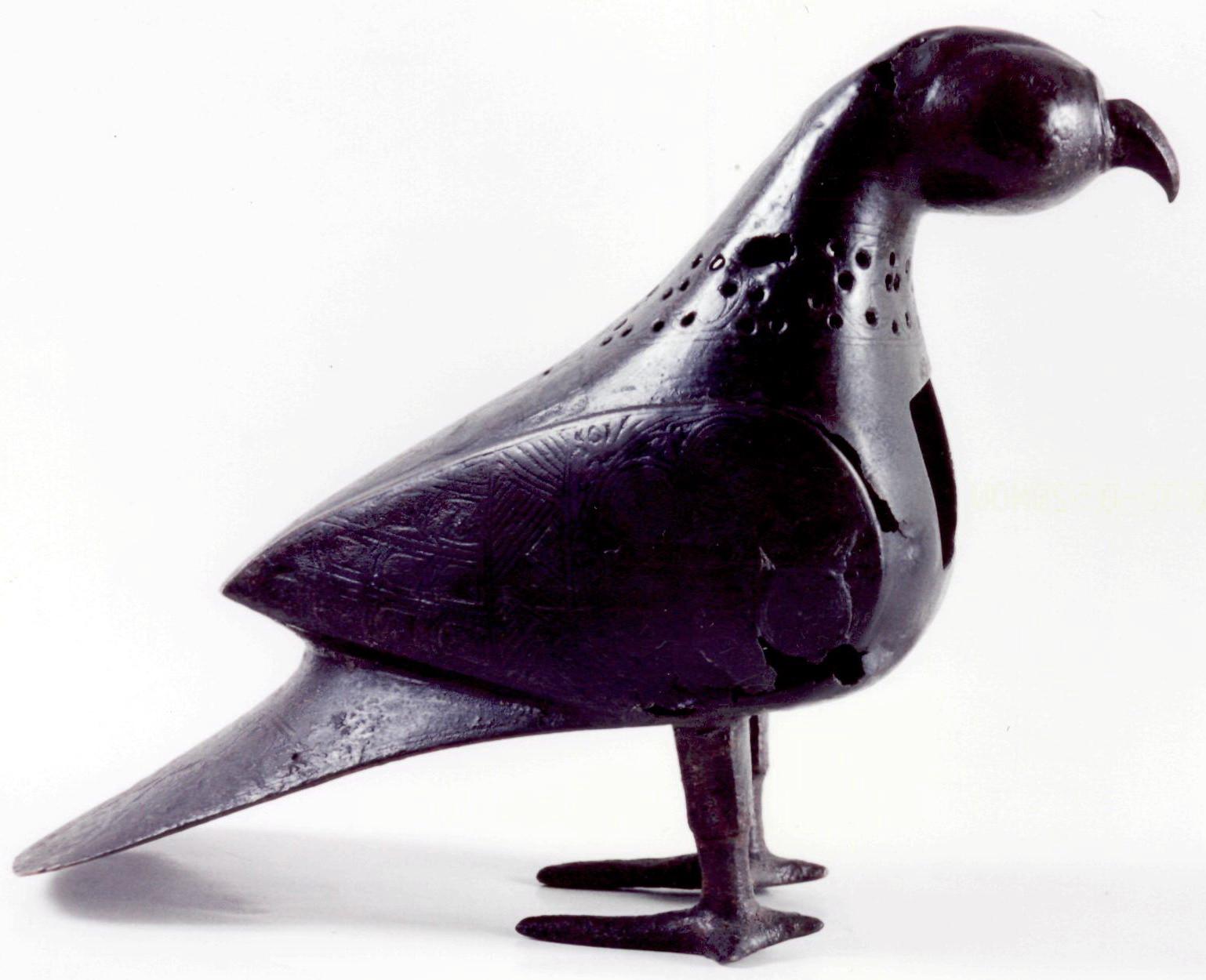 /Кількість: 1/Побутування/творiв такого типу: Incense was used in the Islamic world to scent people and air alike with a fragrant mix of aloes (wood), frankincense and ambergris. According to the historian al-Mas'udi, guests of the ninth-century caliph al-Ma'mun (r. 813-33 CE) were offered an incense burner to perfume themselves before meeting with him (Bloom and Blair 1997, p. 120). Metalwork incense burners were made in a variety of shapes, including animal forms such as lions and birds, which were associated with paradise and good fortune. The head and neck of this piece are hinged to facilitate the placement of the incense, which when burned would emit fragrant smoke through the body’s pierced decoration. A masterpiece of mediaeval bronze casting, this incense burner is a representation of a variety of pigeon called “scandaroon”, a distortion of the name of the Turkish town Iskenderun, itself derived from the name Iskandar (Alexander the Great). This species originated in Iraq and spread westward across the Mediterranean.
