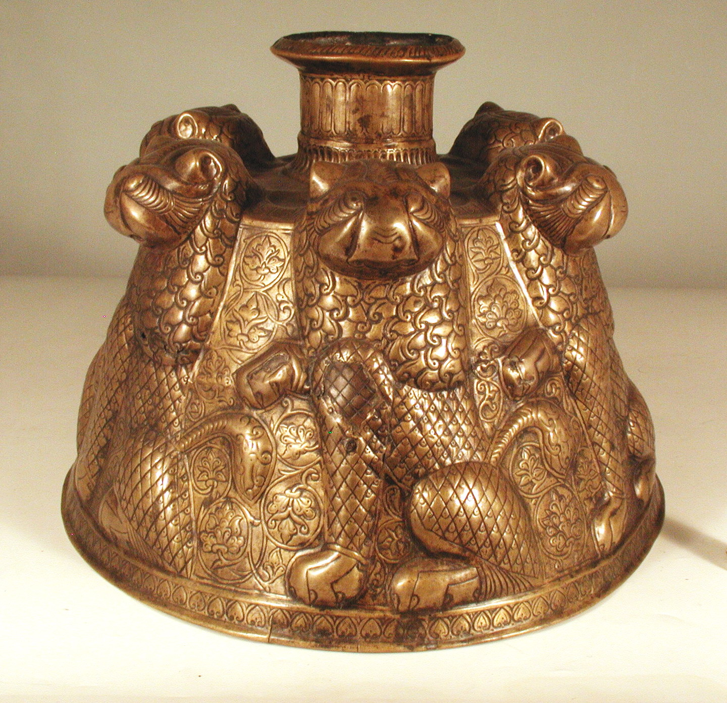 Это единственный предмет среди бронзовых изделий исламского периода стран Ближнего востока, где представлены такие цветы (или пальметки). Другого предмета с таким волнистым стеблем фоне /между фигурами львов/ я не знаю.