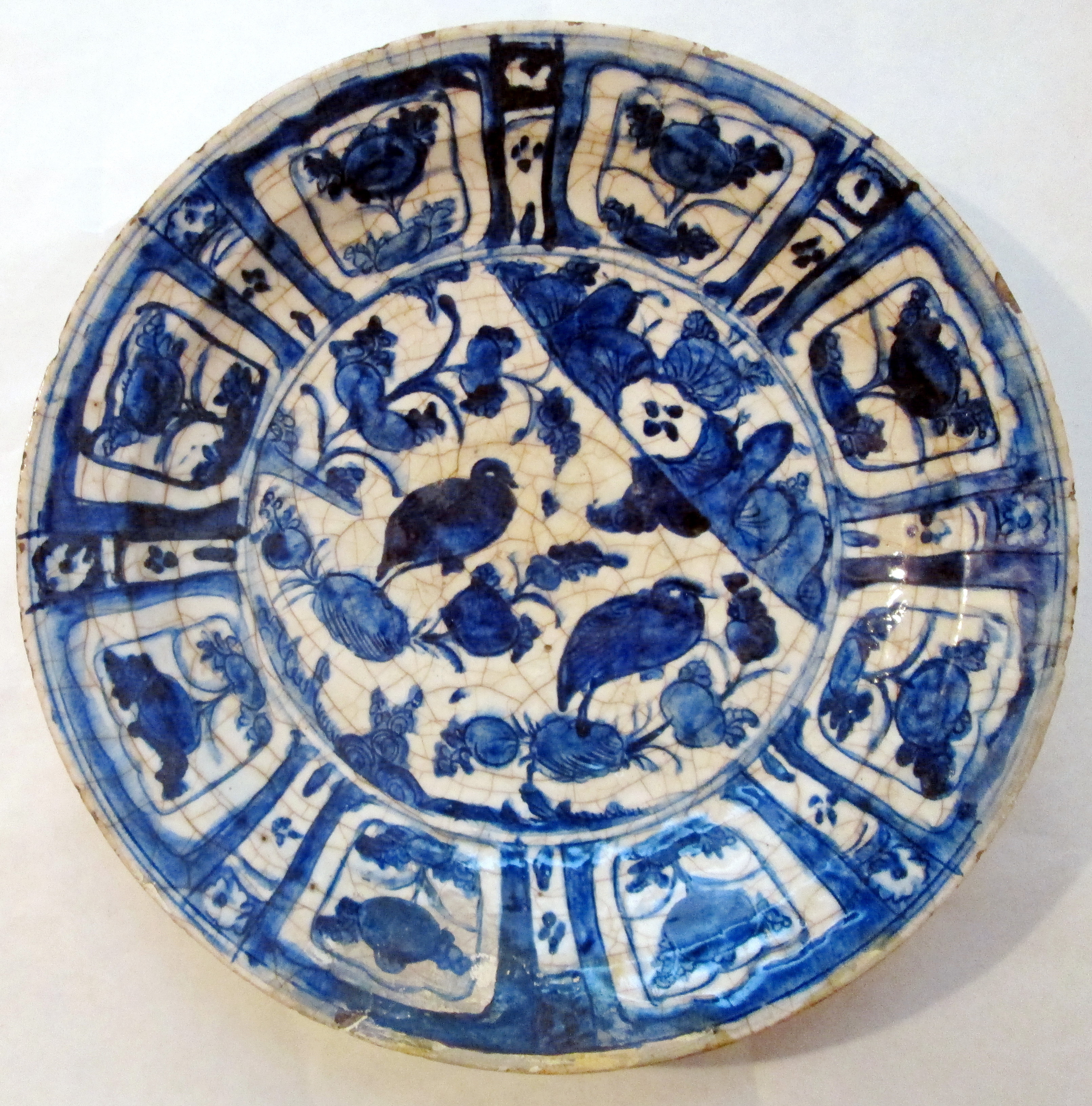 The most popular Chinese designs are found on kraak (the Dutch approximation of “carrack,” referring to the type of Portuguese ship that first brought this porcelain to Europe; see, e.g., Pope, p. 136) ware. The blue-and-white dishes often have brown rims; the usual organization of the surface consists of eight panels encircling a central composition containing a seascape (Plate xlii) or a landscape with decorative motifs including baskets, lotus sprays, birds, insects, deer, and a variety of misunderstood Buddhist symbols. Panels in kraak ware with sketchy painting and dark-gray coloring were still popular toward the end of the Safavid period