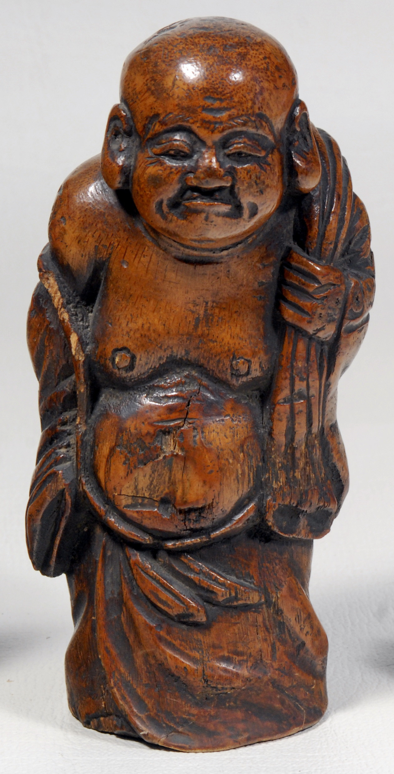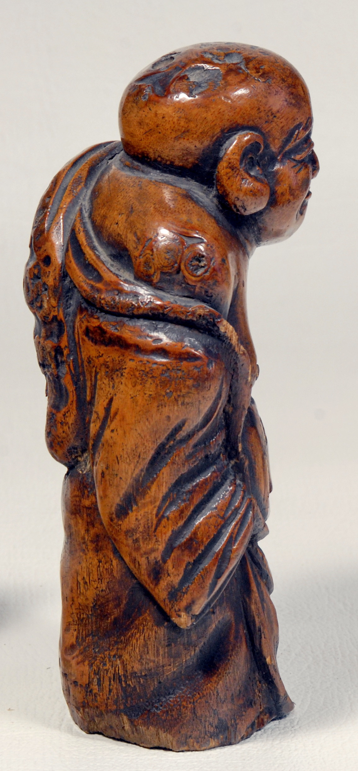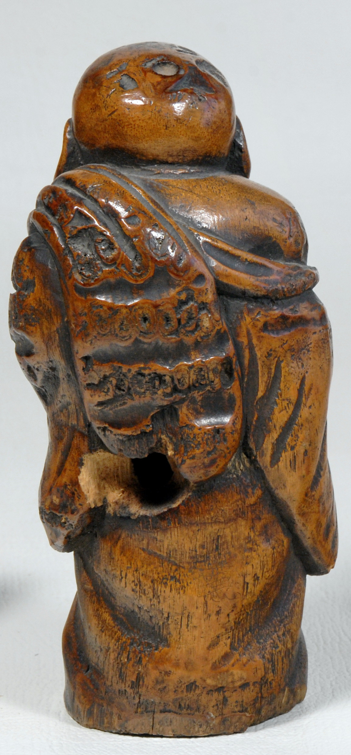 Численні вищерблення з тріщинками быля основи, на животі, на мішку та одязі Хотея. Ззаду – отвір з вищербленими краями.,