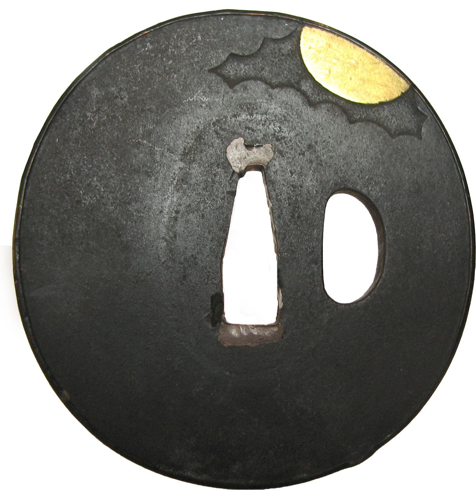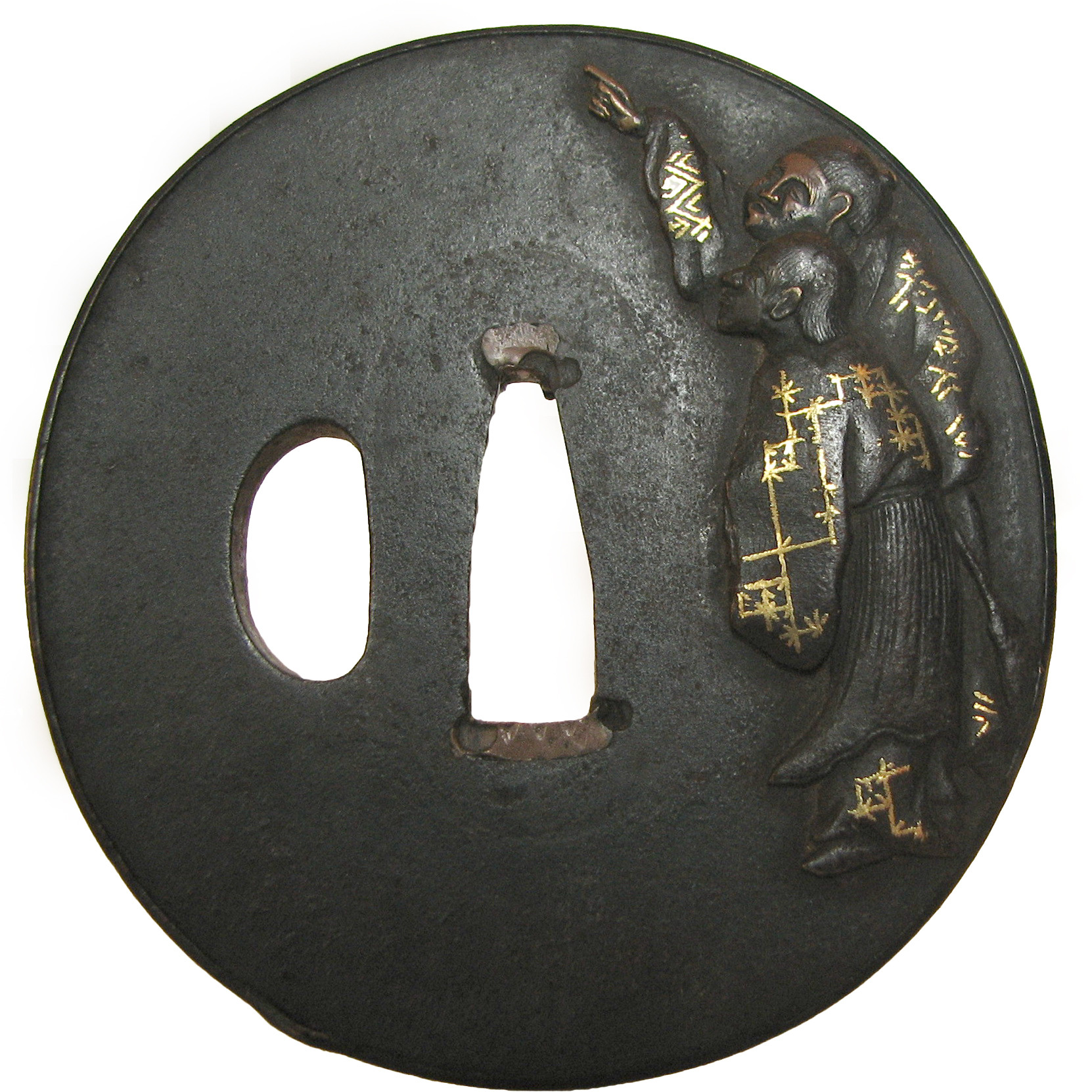 Закладка “Атрибуція” - Наим. предмета, издания: Цуба із зображенням легендарного подружжя Цзо і Уба/Змiн. розміри: 7,2 х 7,0 см/Змiн. час створення: 17-18 ст.Автор, автор съемки: Невідомий майстерНовый материал: залізоНовый материал: бронзаИзм. техника: куванняИзм. техника: гравіруванняИзм. техника: накладний рельєфИзм. техника: інкрустаціяИзм. техника: позолота