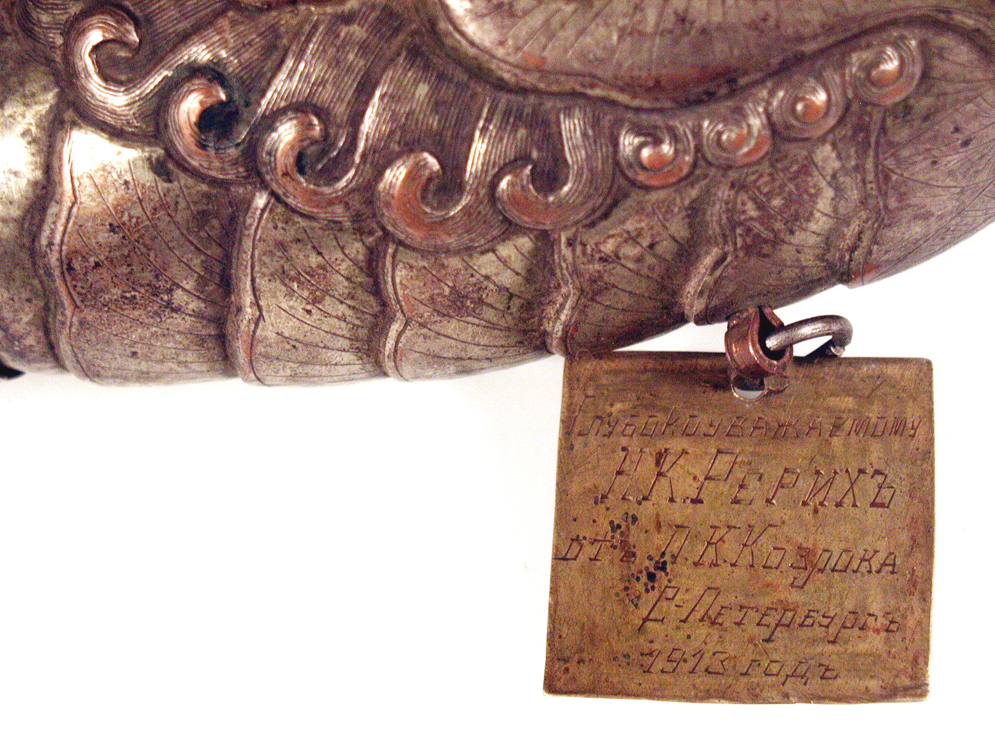 /Кількість: 1/Опис: (тиб. rkang–gling)/ншi написи, штампи, печатки, етикетки, наклейки: Напис на бронзовій підвісній табличці російською мовою в старій орфографії: “Глубокоуважаемому Н.К.Рерихъ отъ П.К.Козлова. С.-Петербургъ/ 1913 годъ”.