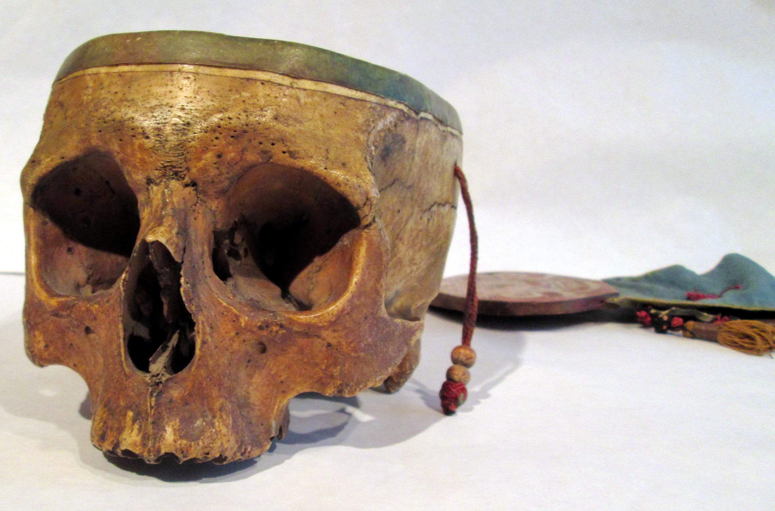 Використані матеріали та техніки: череп людини, Шкіра, Дерево, Шовк, білий метал