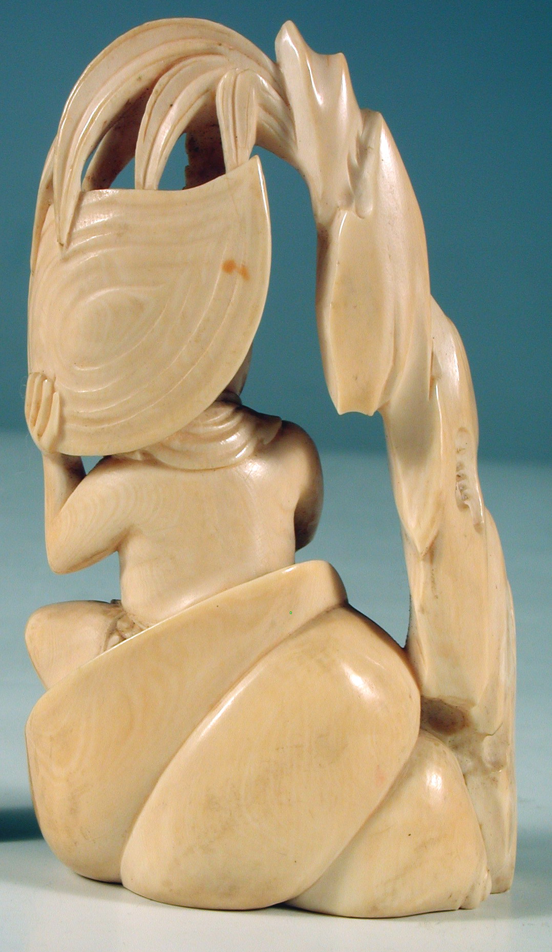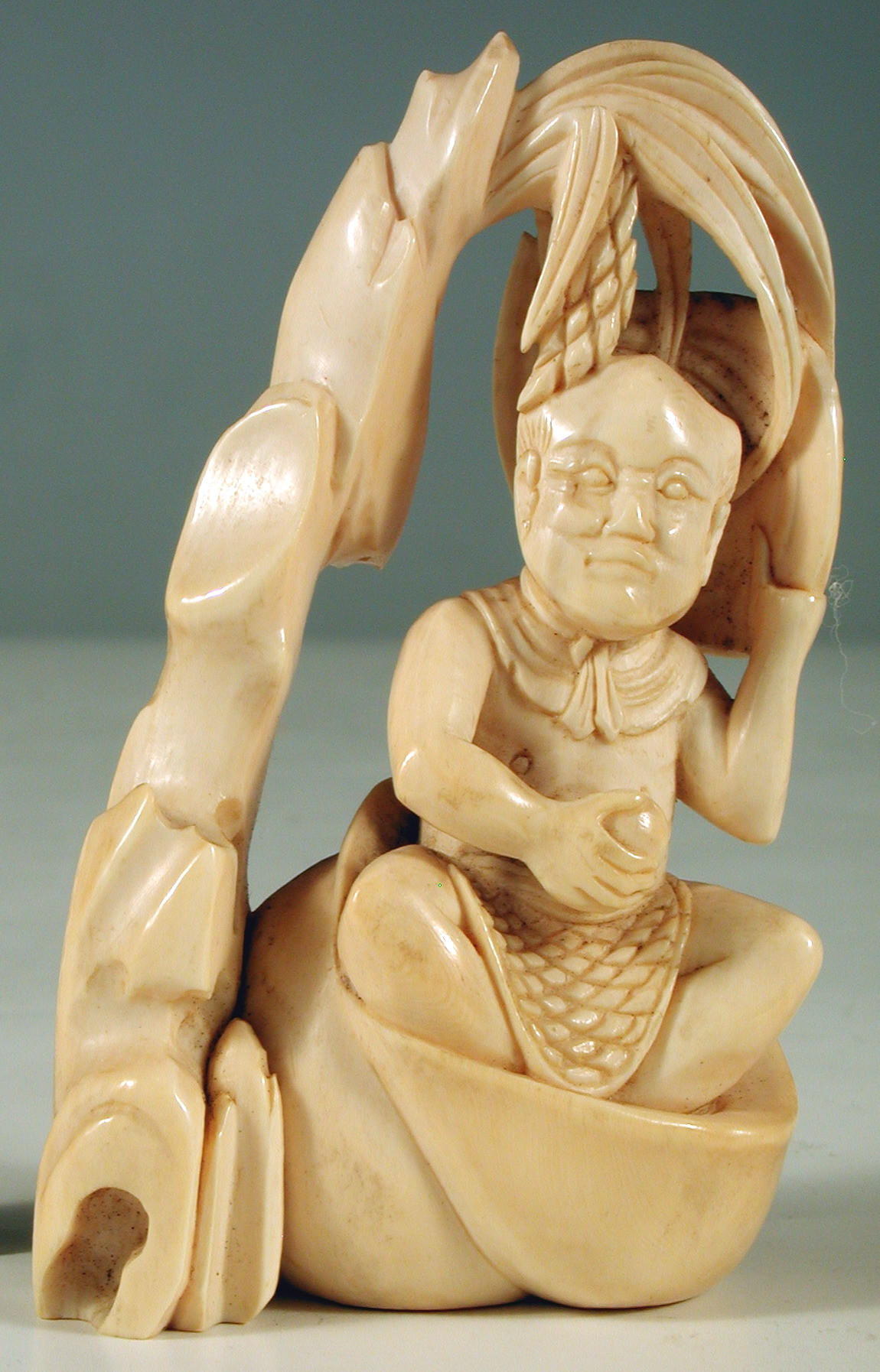 Окімоно – фгурка напівоголеного чоловіка, що сидить під пальмою (?) у великому равлику (?).