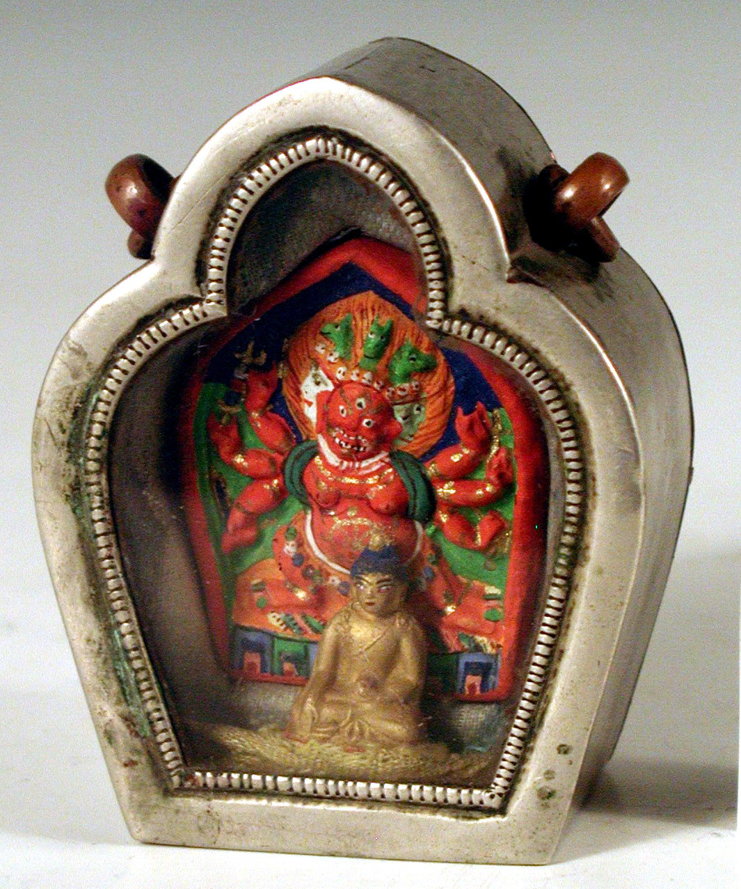 Закладка “Атрибуція” - Наим. предмета, издания: Гау - ладанка із зображенням Шак'ямуні та Хаягриви/Змiн. час створення: 19-20 ст.місце створення, школа: МонголіяНовый материал: бронзаНовый материал: срібний сплавНовый материал: випалена глинаИзм. техника: карбуванняИзм. техника: розфарбування
