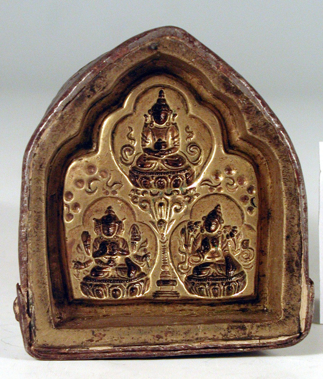Історія Атрибуціi: Огнева О.Д., 2003 р.: Форма для штампування цацха (скр. saccha, тиб. tsha-tsha) із зображенням Амітаюса, Ушнішавіджаї, Авалокітешвари. Монголія, ХVІІІ – ХІХ ст.; бронза, залізо, дерево (кінське копито?)
