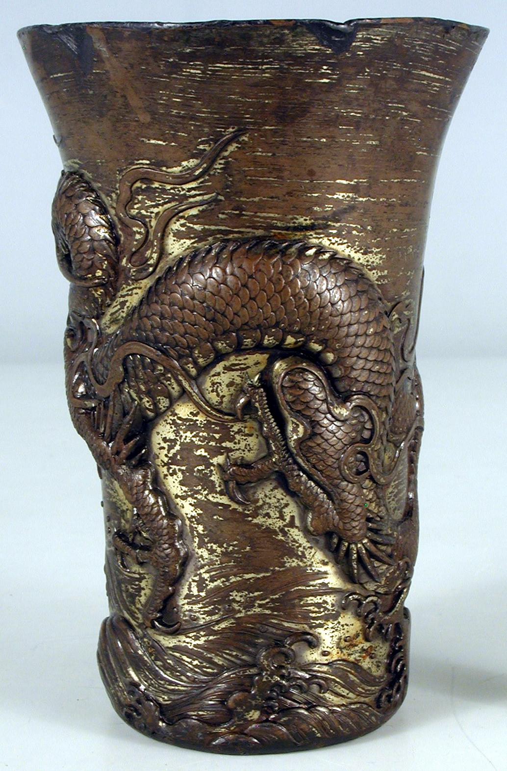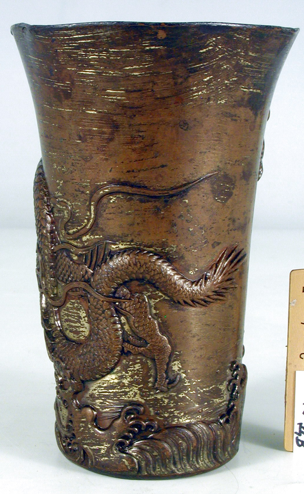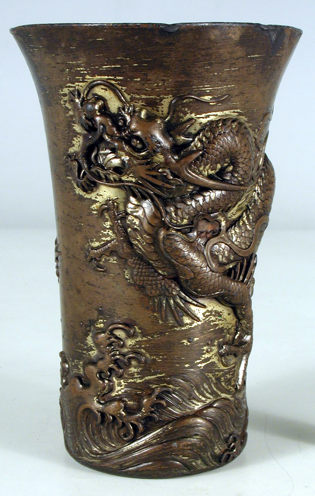 Значні потертості позолоти, краї деформовані, зі щербинками, сліди дикої патини; всередині вкрита біли лисовим металом, значна втрата цього покриття біля краю.,