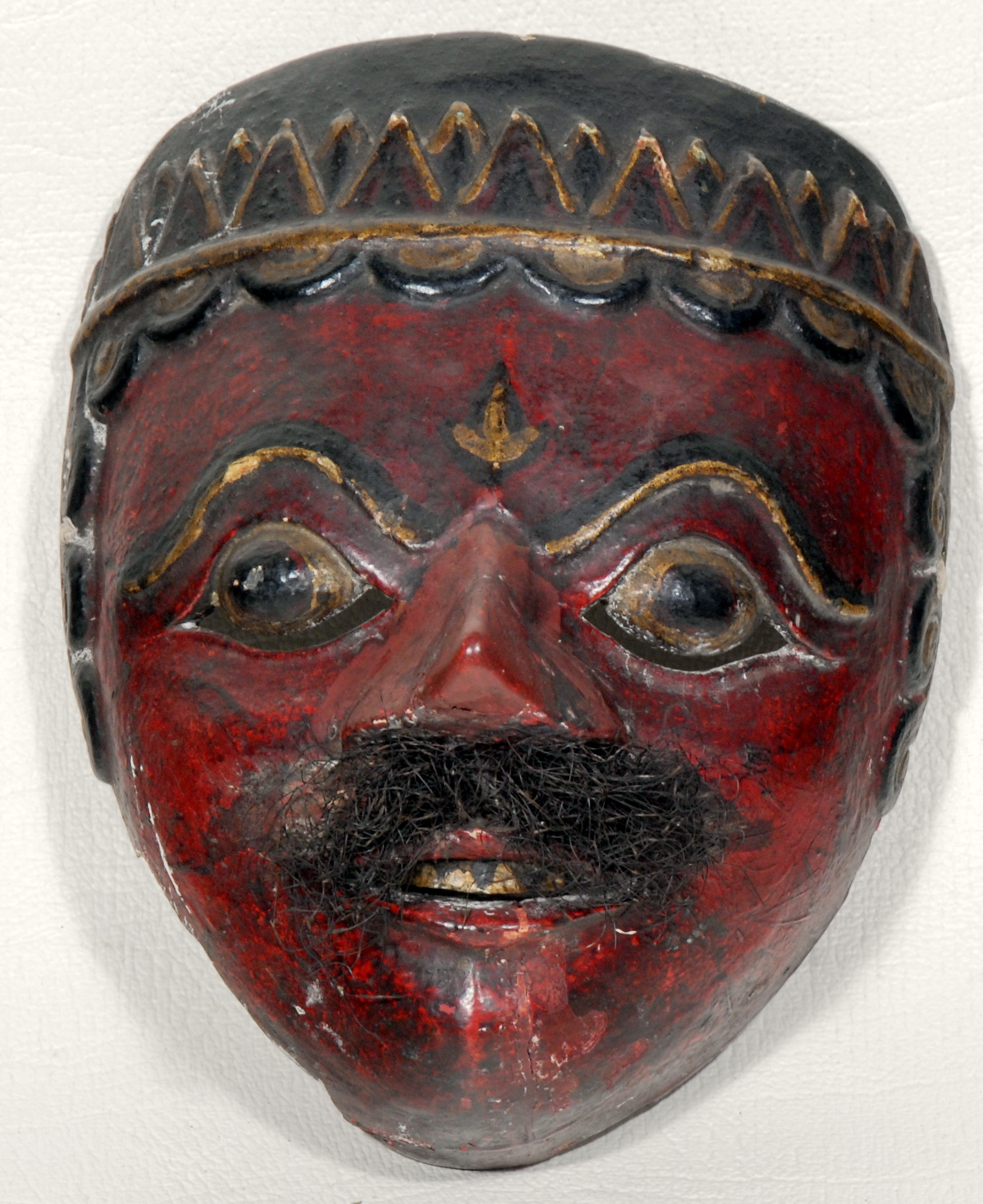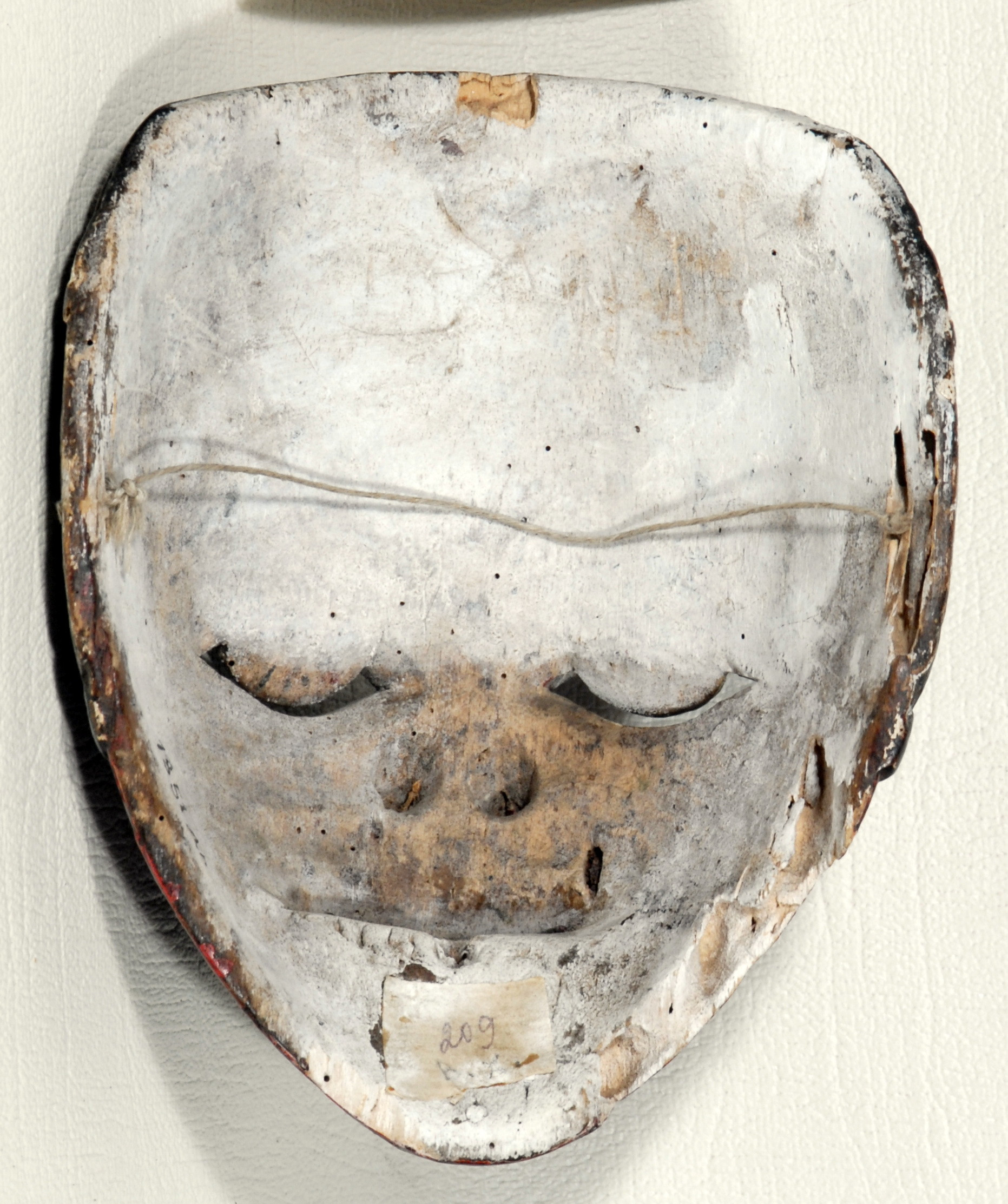 Біля правої щоки, краєм – значна втрата. Відбито кінчик носа.По піддбо-ріддю – глибока вертикальна тріщина, залита клеєм. Осипання @фарбового шару біля правої бро-ви. В заглибинах – забруднена. Сліди реставра-ції на підборідді та на носі.,