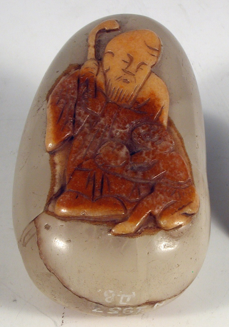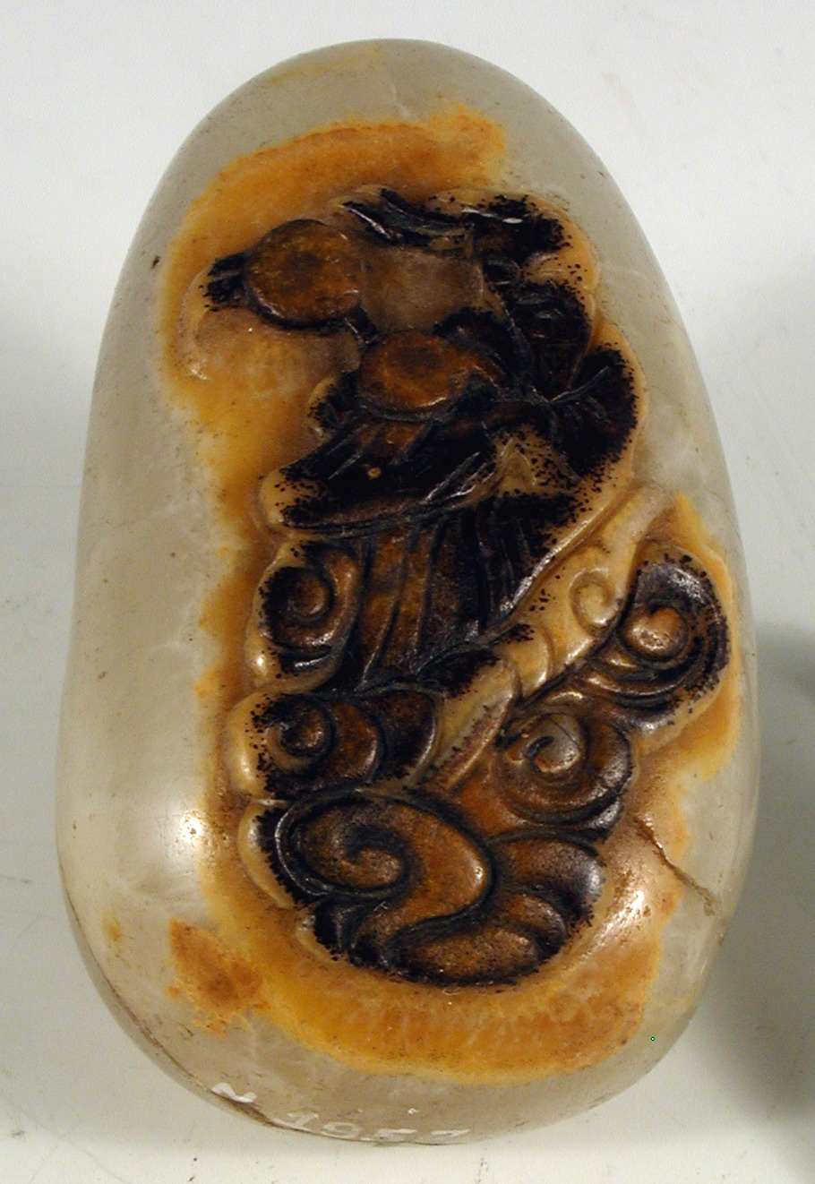 Історія Атрибуціi: Консультація 2017 р. Палкіної Олени Юріївни, кандидата геолого-мінералогічних наук, провідного наукового співробітника Кримського відділення Державного геологорозвідувального інституту (м. Сімферополь, Крим): галька онікса природна. З обох боків твір оброблений, зображення вирізьблене; з лицьового боку - природний колір каменю, зі звороту - підфарбування./Кількість: 1