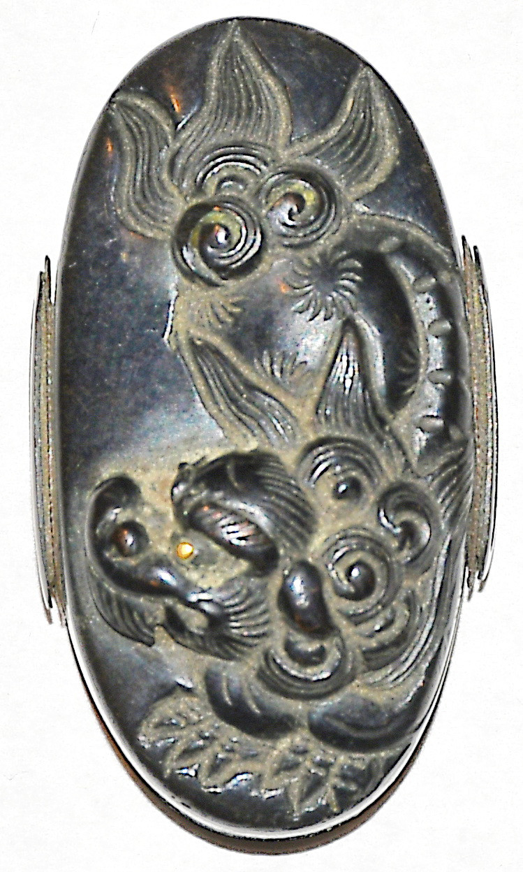 Закладка “Атрибуція” - Наим. предмета, издания: Касіра з левом/Змiн. розміри: 3,4 х 1,8 смНовый материал: бронзаНовый материал: сплав сякудоИзм. техника: куванняИзм. техника: гравіруванняИзм. техника: інкрустація золотом