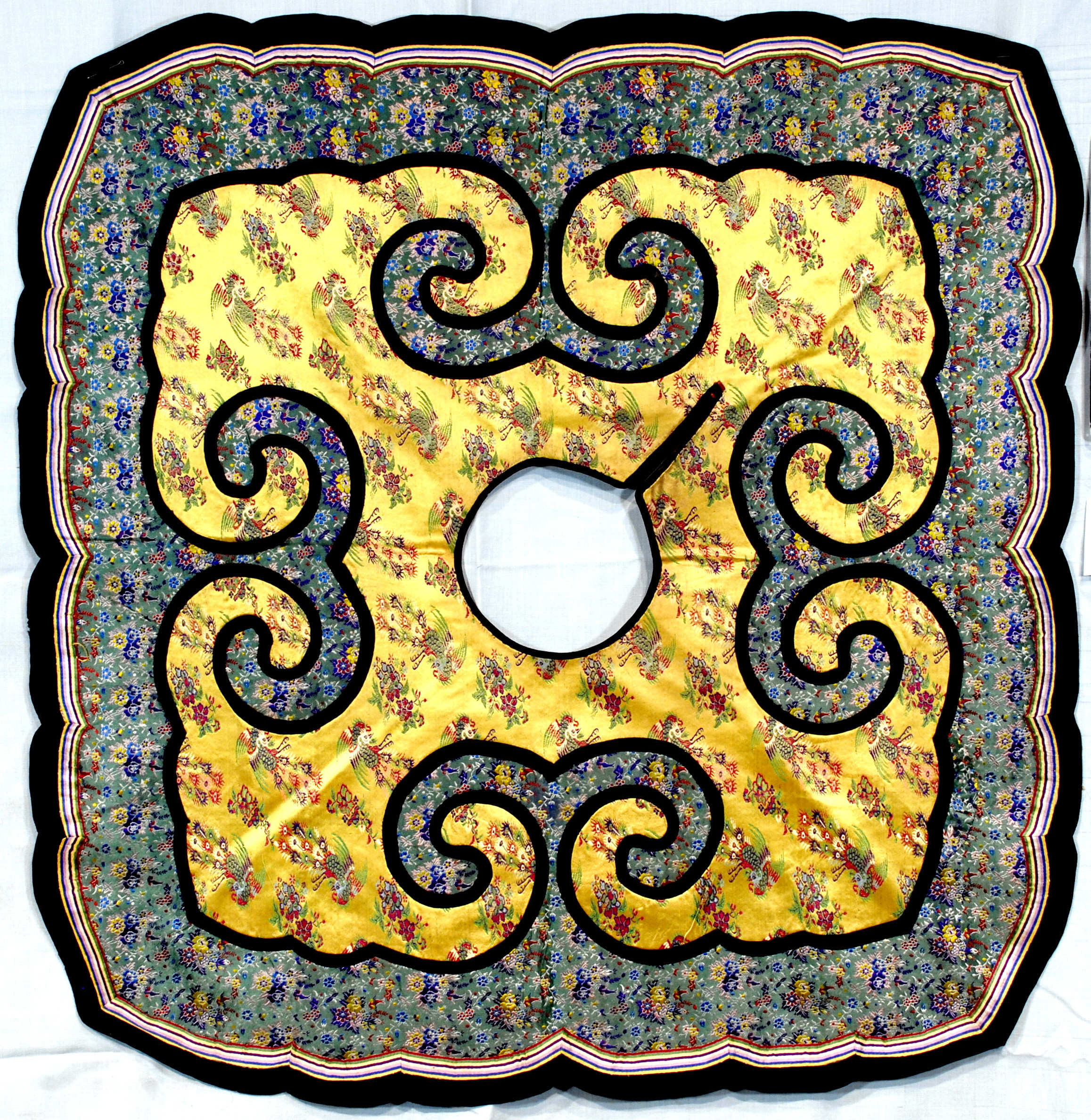 Забруднення та потертості шовку біля коміра, в кількох місцях обрив аплікації.,