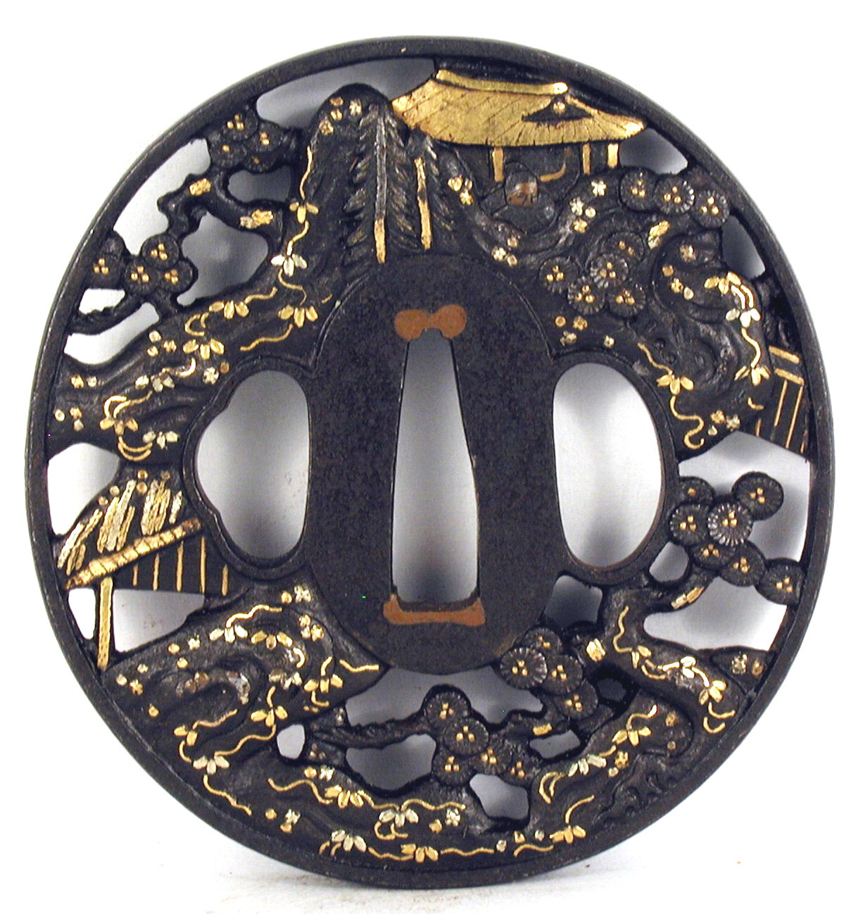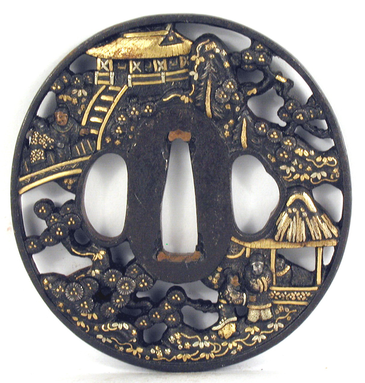 Закладка “Атрибуція” - Наим. предмета, издания: Цуба із зображенням «китайського» пейзажу/Змiн. розміри: 7,5 х 7,9/Змiн.додаток до назва (лист, ...): Цуба залізна, овальної форми ага мару гата, має три отвори ріо хіцу ана, з тонким ободом мімі. Декор виконано у техніці хіконеборі (ажурне різьблення, інкрустація хондзоган та нуномедзоган). Зображення у позитивному силуеті модельовано з обох боків: будівлі серед гір, порослих соснами./Змiн. час створення: 18 - початок 19 ст.Автор, автор съемки: Майстер школи Сотенмісце створення, школа: ЯпоніяИзм. техника: куванняИзм. техника: різьбленняИзм. техника: гравіруванняИзм. техника: інкрустація