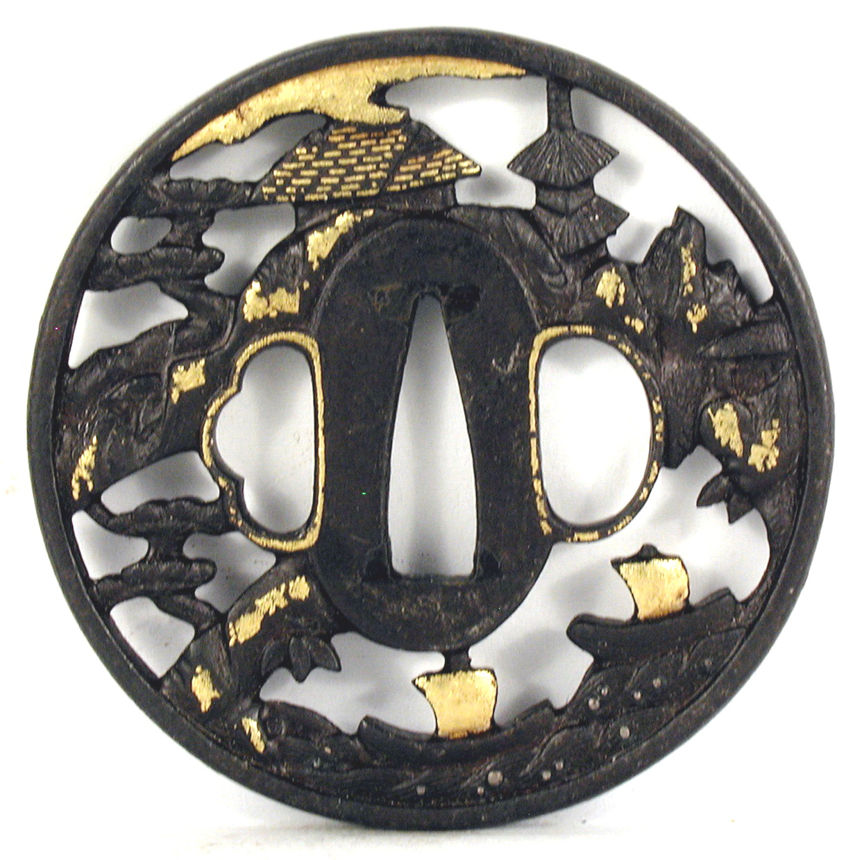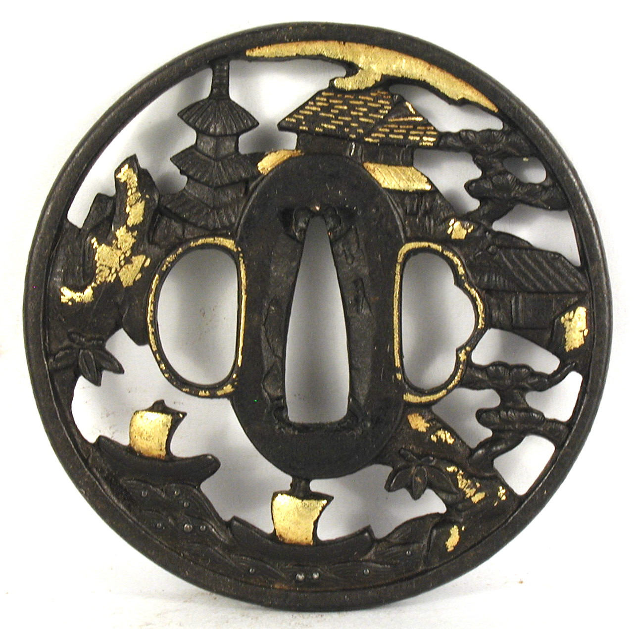 Кількість: 1/Опис: Цуба залізна, патинована, кругла, з вузьким пласким ободом. У позитивній перфорації зображено у низькому рельєфі два вітрильних човна у хвилях, сосну, пагоду та будівлі. Деталі позолочено.