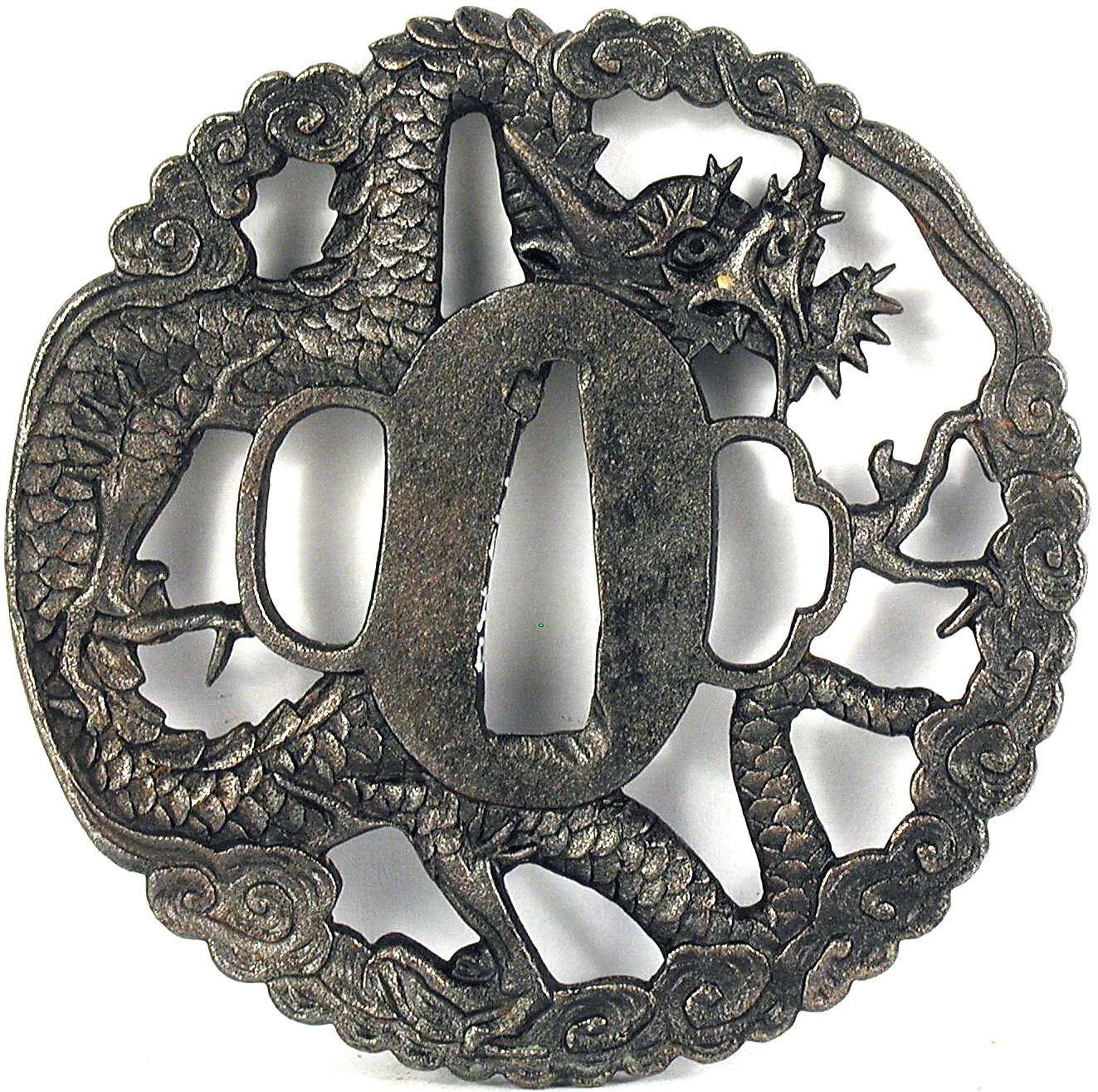 табл. 62 (figura) d. 2.Otto Kümmel. Japanische Stichblatter und Schwertzieraten Sammlung Georg Oeder Düsseldorf. Berlin. 1914, стор. 77, № 645 «Цуба з ажурним зображенням дракона», підпис «Кінаі».