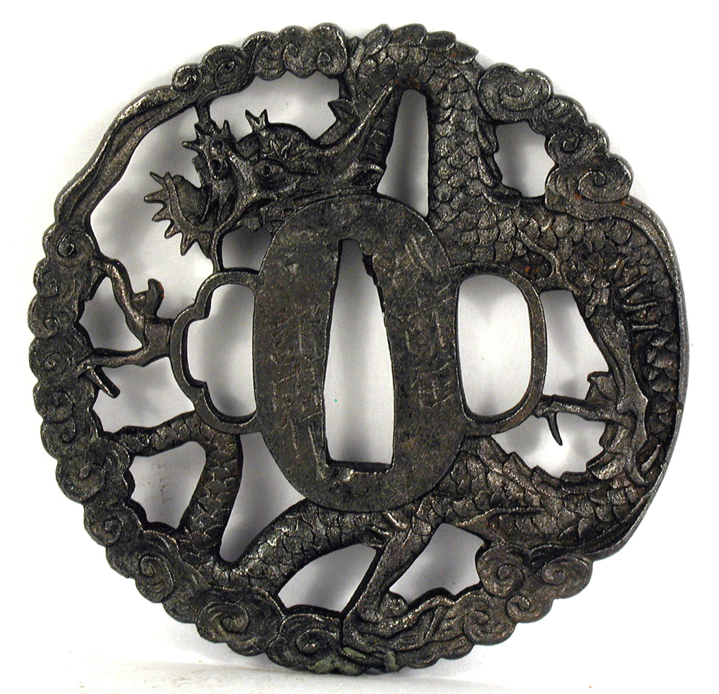 Закладка “Атрибуція” - Наим. предмета, издания: Цуба з зображенням дракона у хмарах/Змiн. розміри: Д - 8,1 см/Змiн.додаток до назва (лист, ...): Цуба залізна, кругла форма мару гата з трьома отворами ріо хіцу ана. Контур цуба утворює зображення хмар і тіла дракона у позитивному силуеті. Виконано наскрізним різьбленням (модельовано з обох сторін)./Змiн. Написи, клейма, марки: На аверсі на сеппа-даі праворуч від накаго ана гравіровано: «Etizen ju». ліворуч – «Kinai saku».Автор, автор съемки: Майстер школи Кінаімісце створення, школа: провінція ЕтідзенИзм. техника: куванняИзм. техника: карбуванняИзм. техника: різьбленняИзм. техника: гравірування