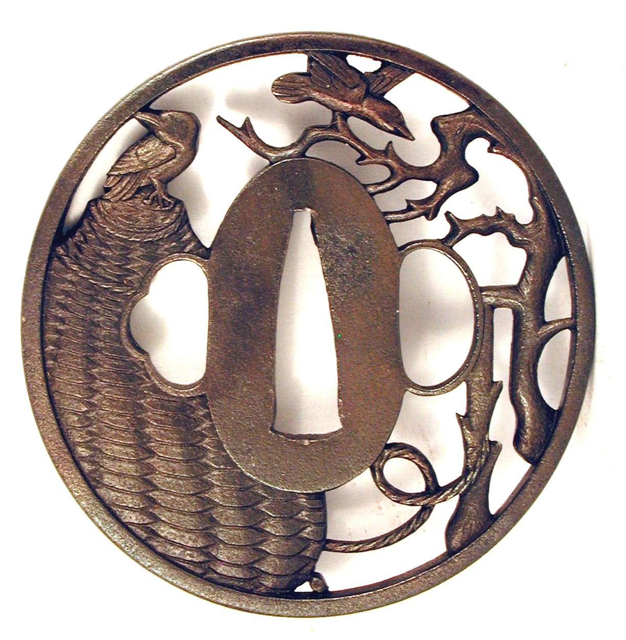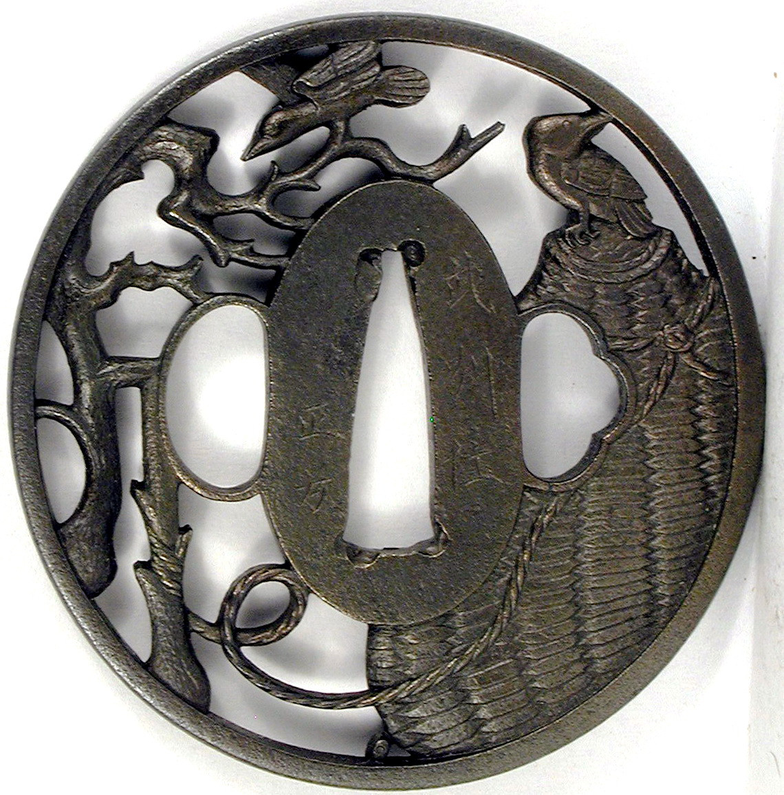 Авторські підписи, клейма: Уздовж центрального отвору гравіровано підпис: Масаката, що мешкає в провінції Мусасі./Історія Атрибуціi: 1. Консультація 1961 р. наукового співробітника Державного Ермітажу, канд. іст. наук В.Т. Дашкевич: Масаката, провінція Мусасі, м. Едо, школа Іто. Друга половина 18 ст./Кількість: 1