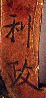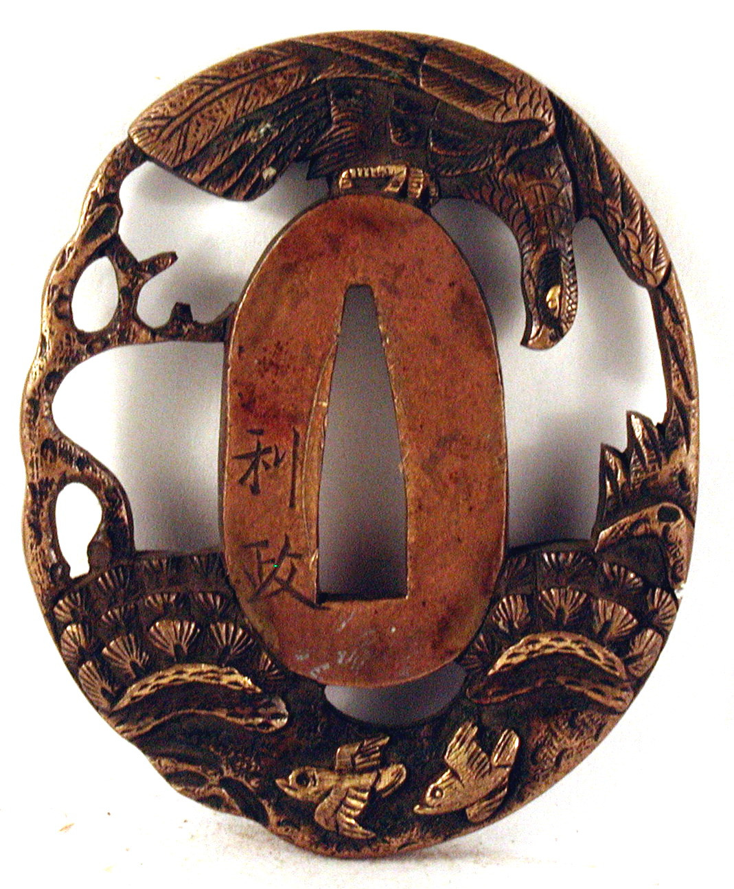 Авторські підписи, клейма: Уздовж центрального отвору гравіровано підпис: Тосімаса, провінція Хітаті, м. Міто./Історія Атрибуціi: Japanese Art Signatures. By James Self and Nobuko Hirose. 2005, p. 224-279.